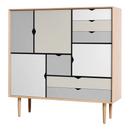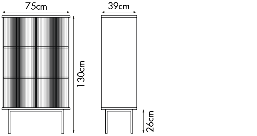 | Material | Korpus: UV-lackiertes Valchromat (durchgefärbte Holzfasern/MDF) mit auf Wasserbasis lackierten Kanten Gestell: Stahlrohr, pulverbeschichtet Glastüren aus gehärtetem, geriffeltem Klarglas |