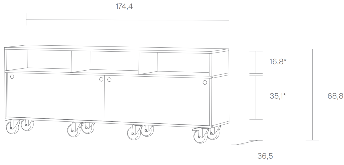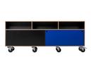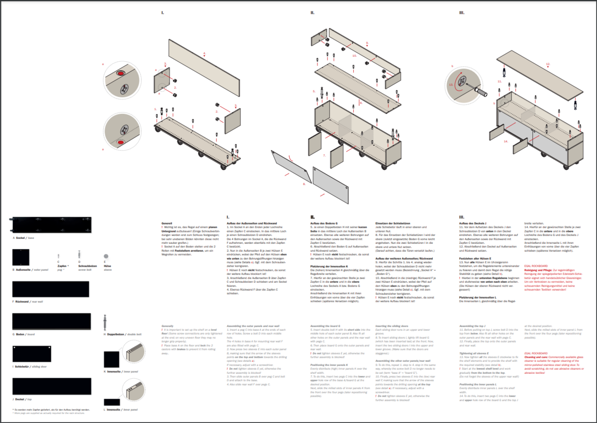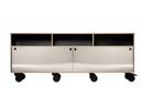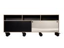 | Material | Korpus: Furniersperrholz Birke Rollen: Kunststoff, Stahlgestell verzinkt Schiebetüren: MDF, lackiert oder Edelstahl, poliert |