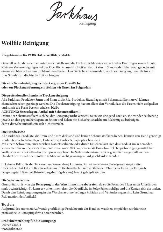 | Pflege | Kleinere Verunreinigungen können aufgrund der Materialeigenschaften meist problemlos mit feuchtem Tuch, Bürste oder Staubsauger entfernt werden. Bei starker Verunreinigung entweder professionelle chemische Trockenreinigung oder bei Auflagen ohne Polsterung Handwäsche bis 30 Grad. Nicht schleudern oder auswringen. Nicht in Waschmaschine oder Trockner geben! Weitere Informationen zur Pflege finden Sie im folgenden Infoblatt (PDF, ca. 0,1 MB) ![]() |