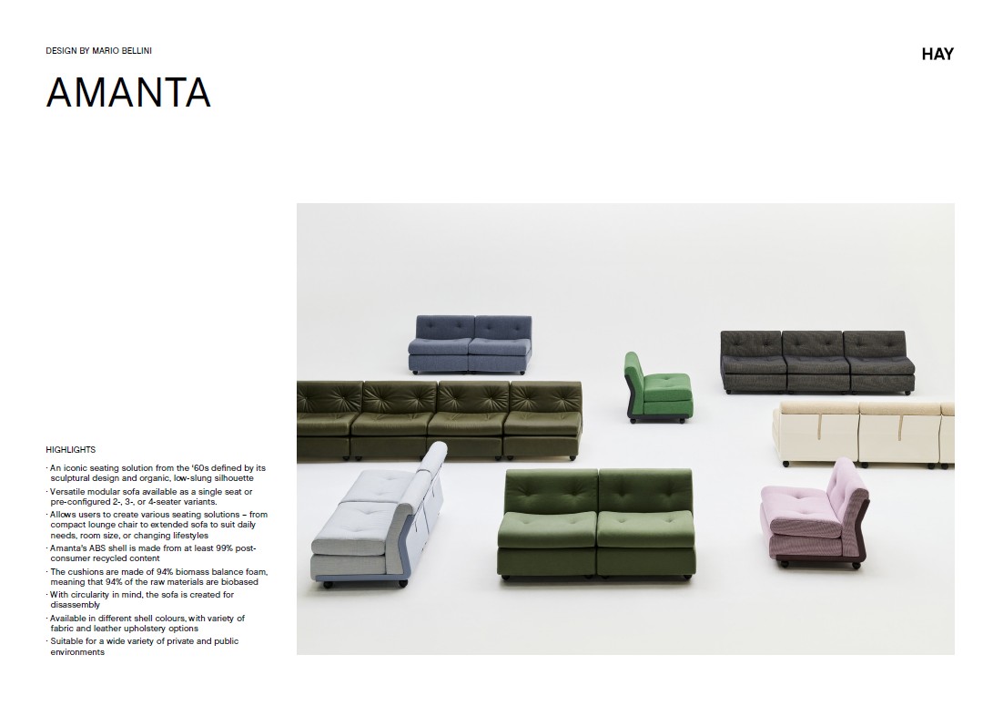 Das Amanta 2-Sitzer Sofa von HAY, die erste Neuauflage eines italienischen Designs in der Geschichte des Unternehmens, bringt die zeitlose Genialität von Mario Bellini in die Gegenwart. Das 1966 entworfene Sofa verkörpert mit seiner ikonischen Form und organischen, niedrigen Silhouette die Essenz innovativen Designs. Die modulare Bauweise erlaubt eine vielseitige Kombination der Elemente, während die Verwendung von 99 % recyceltem ABS und nachhaltigen Schaumstoffkissen die Verantwortung des Designers für Form und Funktion unterstreicht.