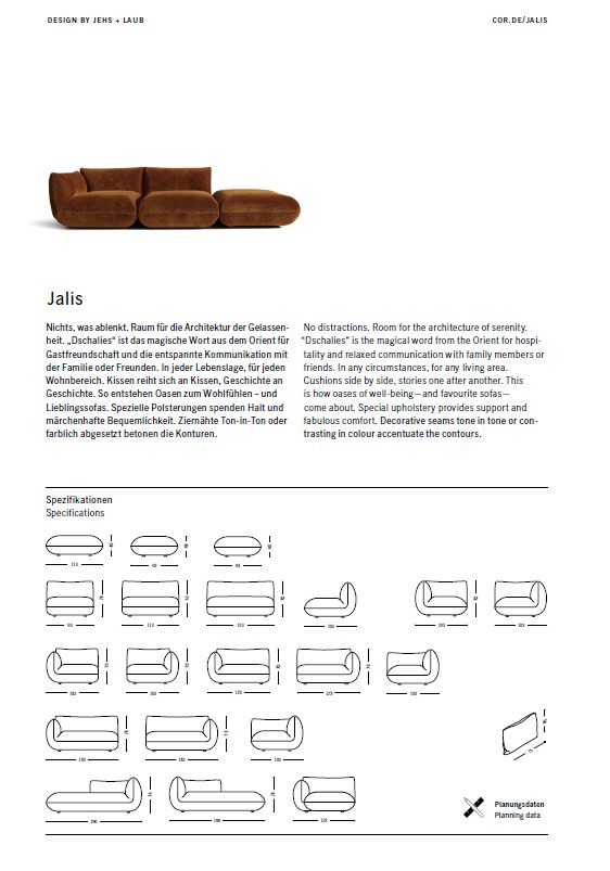 Entworfen vom Studio Jehs + Laub, verkörpert das Jalis Sofa die Architektur der Gelassenheit und die Essenz orientalischer Gastfreundschaft. Die Aneinanderreihung von Kissen schafft Oasen zum Wohlfühlen, die zur entspannten Kommunikation mit Familie oder Freunden einladen. Spezielle Polsterungen des Sofas spenden Halt und außergewöhnliche Bequemlichkeit, während Ziernähte die Konturen des harmonischen Designs betonen.