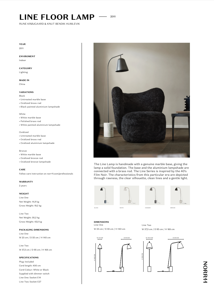 Die Line Two von Norr11 ist eine elegante Stehleuchte in minimalistisch skandinavischem Design von Rune Krøjgaard und Knut Bendik Humlevik. Der raffinierte Materialmix aus Marmorfuß, schmalem Stahlrohr und schlichtem Schirm sorgt für einen spannenden Kontrast und außergewöhnlichen Lichtspender.