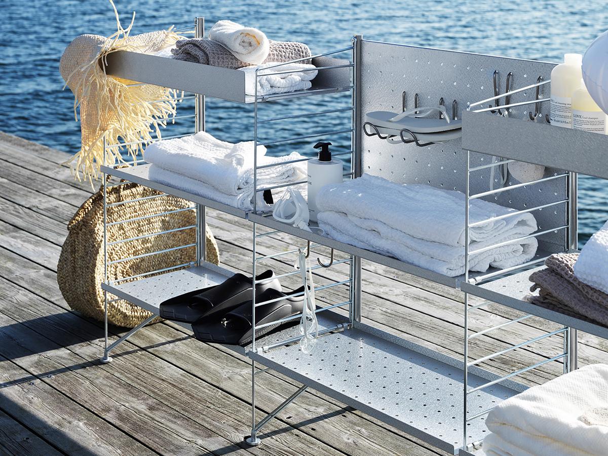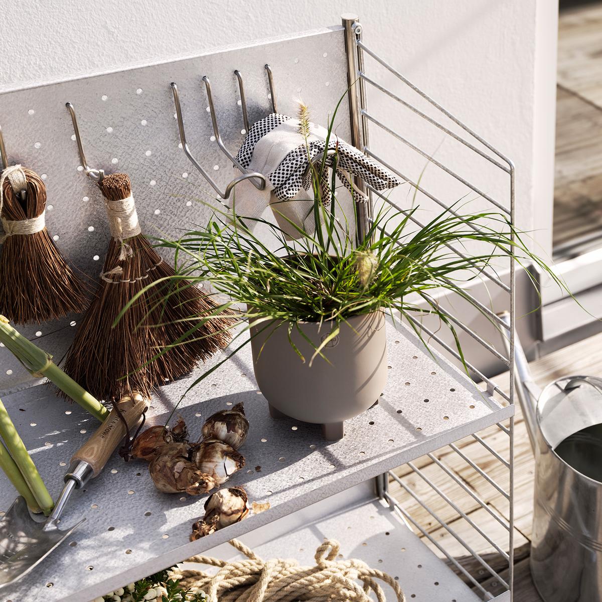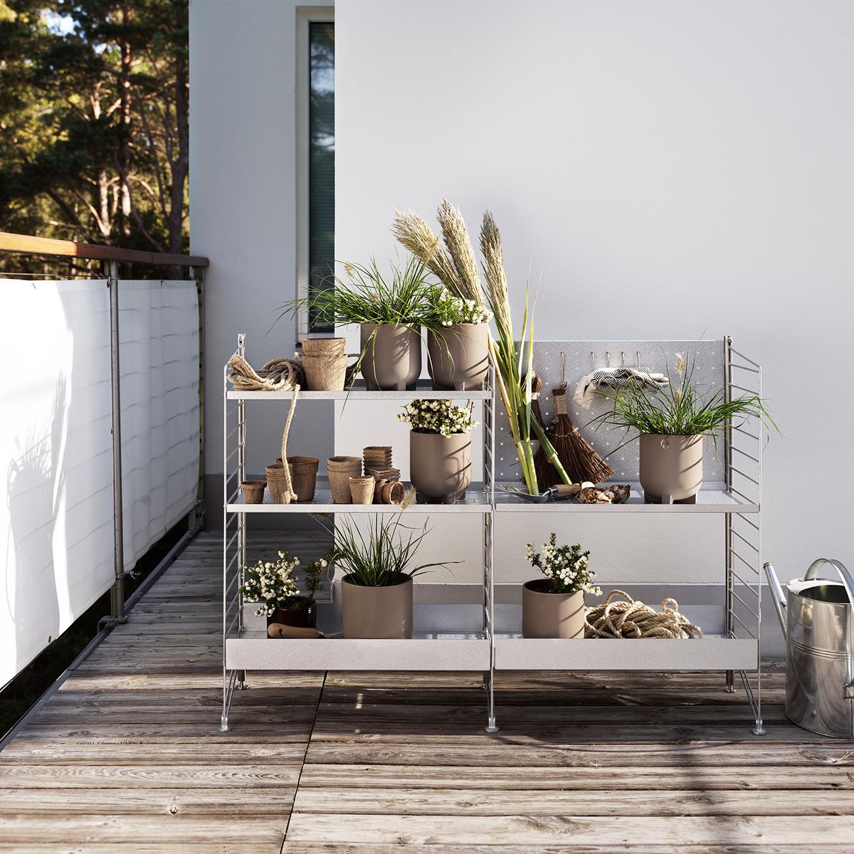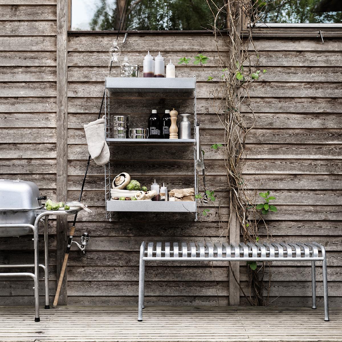 String, Hersteller des legendären String Regalsystems von Kajsa & Nisse Strinning, hat sich mit String Outdoor jetzt einem verbreiteten Problem angenommen: Obwohl im Garten bei Gartenarbeit oder Grillparty jede Menge Gegenstände gebraucht werden, sind insbesondere schöne Aufbewahrungsmöglichkeiten und Ablageflächen dort oft rar.