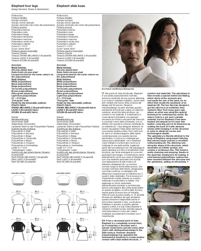 Eva Paster, geboren 1971, und Michael Geldmacher, geboren 1968, haben sich während ihres Studiums in München kennengelernt und dort 1999 das Studio Neuland Industriedesign etabliert. Ihrer gemeinsamen Arbeit liegt die Überzeugung zugrunde, dass Produkte Ausdruck einer Lebensanschauung sind. So versuchen sie, mit neuen ästhetischen Formulierungen auf sich verändernde Werte zu reagieren - weniger aus Interesse an neuen Trends als vielmehr aus der Bestrebung heraus, funktionales Design für die Gegenwart zu schaffen. Seit 2005 beschäftigt sich Neuland Industriedesign, die mit klassischem Produktdesign in den Bereichen Kosmetik, Medientechnik und Outdoor gestartet sind, hauptsächlich mit Möbeldesigns für internationale Partner, neben Kristalia etwa Nils Holger Moormann, MDF Italia und Interlübke. Für Kristalia haben sie neben den Elephant Chairs außerdem den Stuhl Sharky designt. Eva Paster und Michael Geldmacher, beide auch als Dozenten tätig, sind als Team mit zahlreichen Preisen wie dem Compasso d'Oro ausgezeichnet worden.