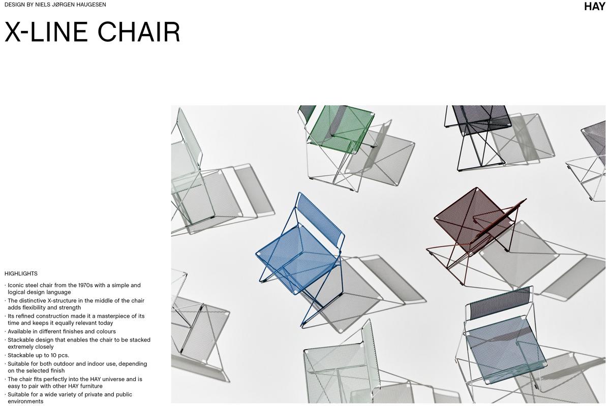 Der in den 1970er Jahren von Niels Jørgen Haugesen entworfene X-Line Stuhl wurde von HAY neu aufgelegt und strahlt dabei in vielen neuen Farbvarianten. Der Möbelklassiker besticht vor allem durch sein zeitloses und minimalistisches Design. Die X-Struktur, aus dünnem Metalldraht gefertigt, kombiniert Stabilität mit Funktionalität, wodurch der Stuhl sowohl stapelbar als auch vielseitig einsetzbar ist.