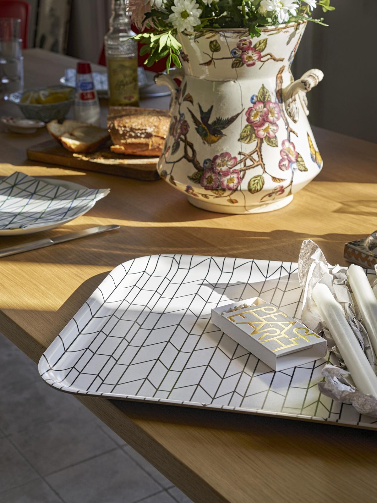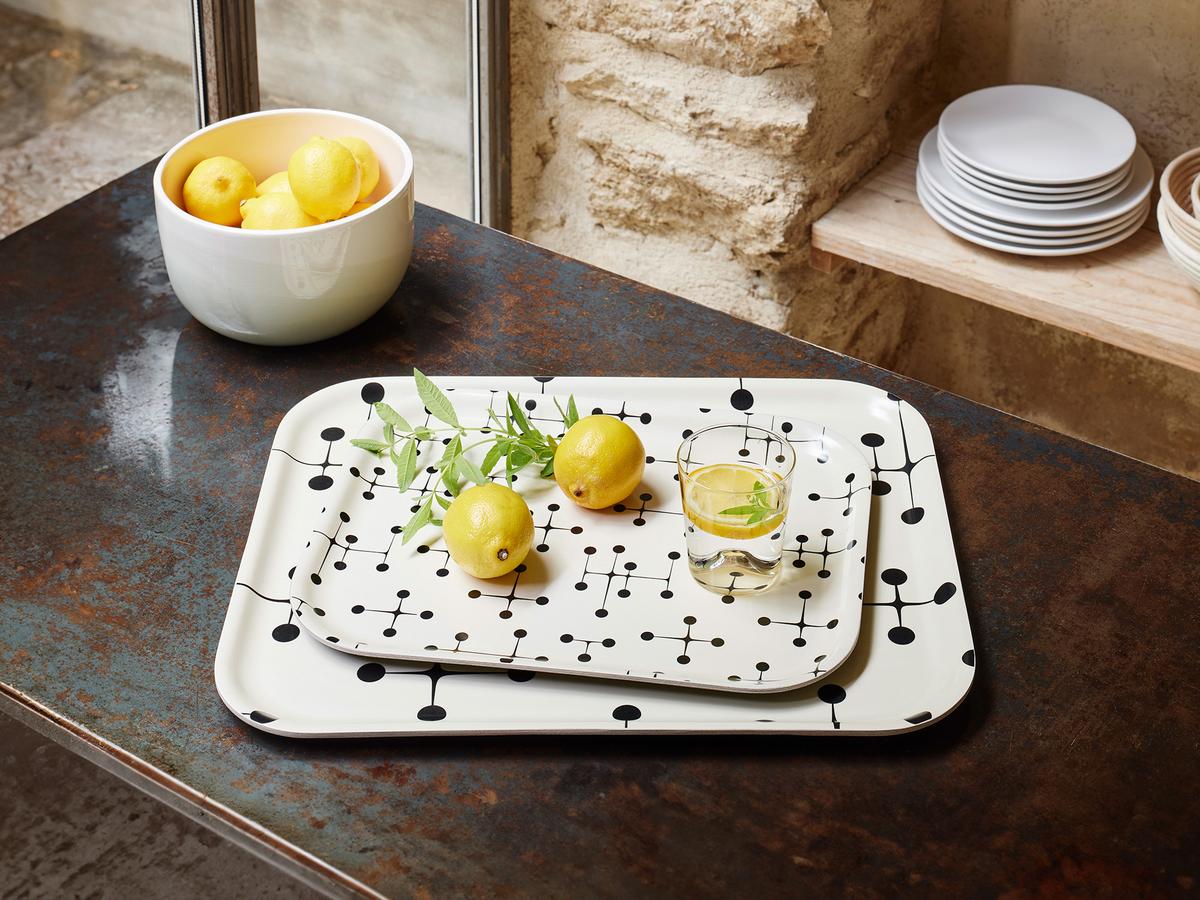 Designtabletts kommen in erster Linie überall da zum Einsatz, wo serviert wird. Ganz egal, ob im gastronomischen oder privaten Bereich, zum Beispiel auf einer Familienfeier oder einfach bei einem Essen mit Freunden zu Hause, mit Tabletts lassen sich Gläser, Teller und Mahlzeiten praktisch transportieren. Damit das noch leichter fällt, sind manche Modelle zusätzlich mit Griffen neben der Tragfläche ausgestattet. Wer allerdings denkt, Designertabletts seien nichts weiter als praktische Haushaltshilfen, hat sich geirrt: Designtabletts haben zusätzliche Funktionen und sind vor allem besonders dekorative Alltagsgegenstände. Auf so schönen Modellen wie dem Vitra Rotary Tray können Lebensmittel oder andere Gegenstände besonders ansprechend präsentiert werde. Auch edle Holztabletts wie das Fritz Hansen Tablett aus der Objects Kollektion setzen einmalige ästhetische Akzente in Ihrer Inneneinrichtung. Beschichtete Tabletts lassen sich zudem auch als praktische und leicht zu reinigende Unterlage bei der Vor- und Zubereitung von Speisen einsetzen. Große Designtabletts können wiederum spielend kleine Beistelltische ersetzen.