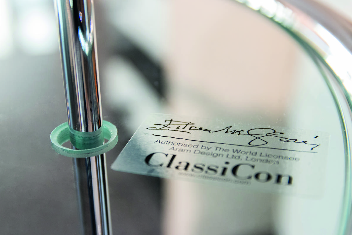Das Original überzeugt durch sauber geschliffene, verschweißte und verchromte Stahlrohre, die unter Einsatz spezieller Werkzeuge so nur bei Classicon hergestellt werden können. Die präzisen Rundungen garantieren den perfekten Stand des Adjustable Table. Ein ins Stahlrohr eingeprägter Herstellernachweis und ein nahezu unsichtbarer Aufkleber auf der Kristalltischplatte belegen den Kauf eines Originals.