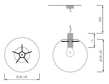 | Material | Kugel: mundgeblasenes Klarglas Leuchtenkopf: pulverbeschichtetem Metall Kabel: stoffummantelt |