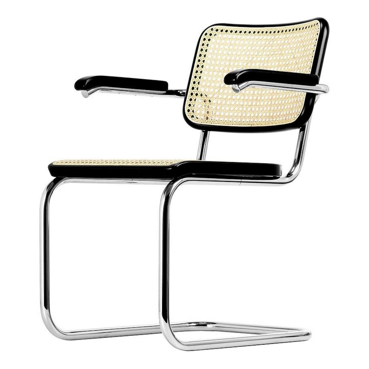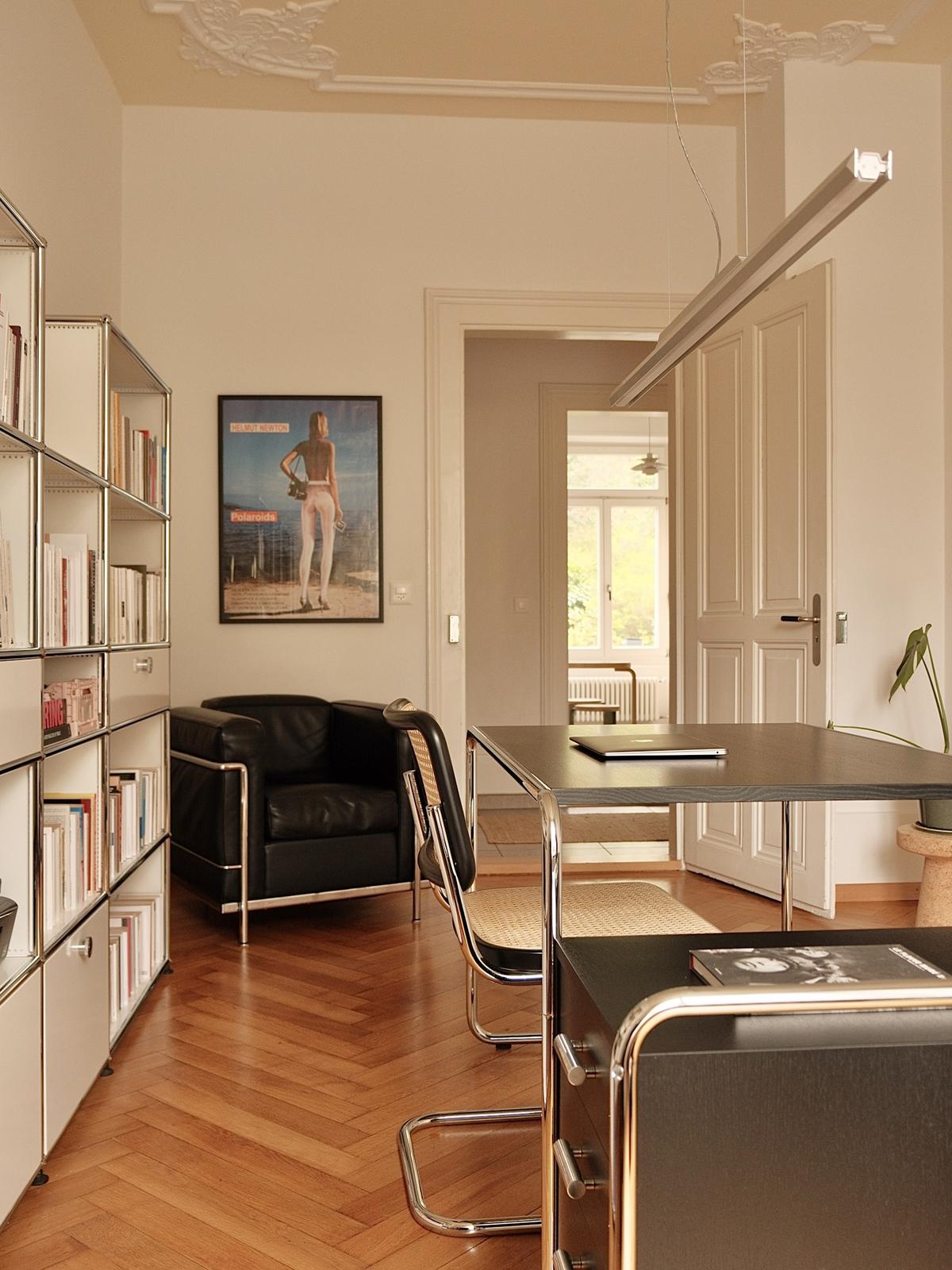 Das Arbeitszimmer wurde unter anderem mit zwei Designikonen von Marcel Breuer aus elegantem Stahlrohr ausgestattet. Der Thonet Schreibtisch S 285 und der Freischwinger S 32 stammen aus der Bauhaus-Ära und stellten damals wie heute eine Brücke zwischen Neuem und Bewährtem dar: Wiener Rohrgeflecht und Holzelemente symbolisierten das Traditionelle, während Stahlrohr die Zukunft voraussagte.