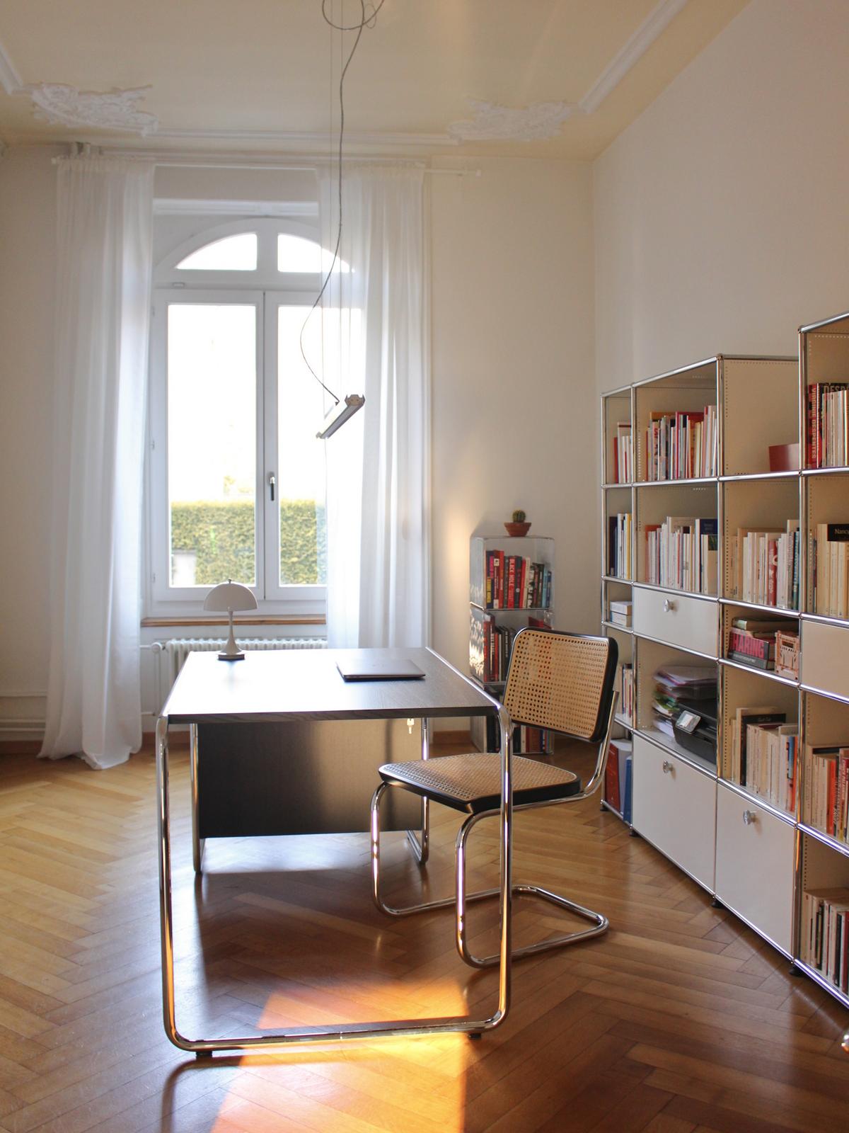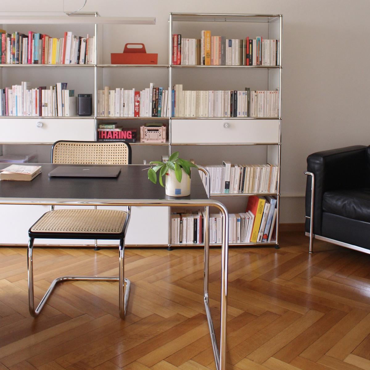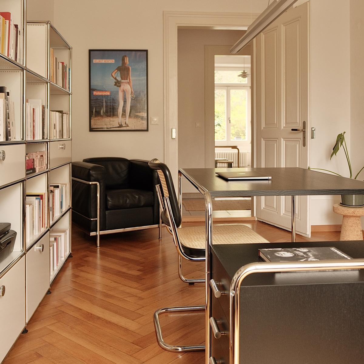 Bei si.len.cio ist der Name Programm: Der Thonet Schreibtisch S 285 von Marcel Breuer ergänzt die USM Haller Wand