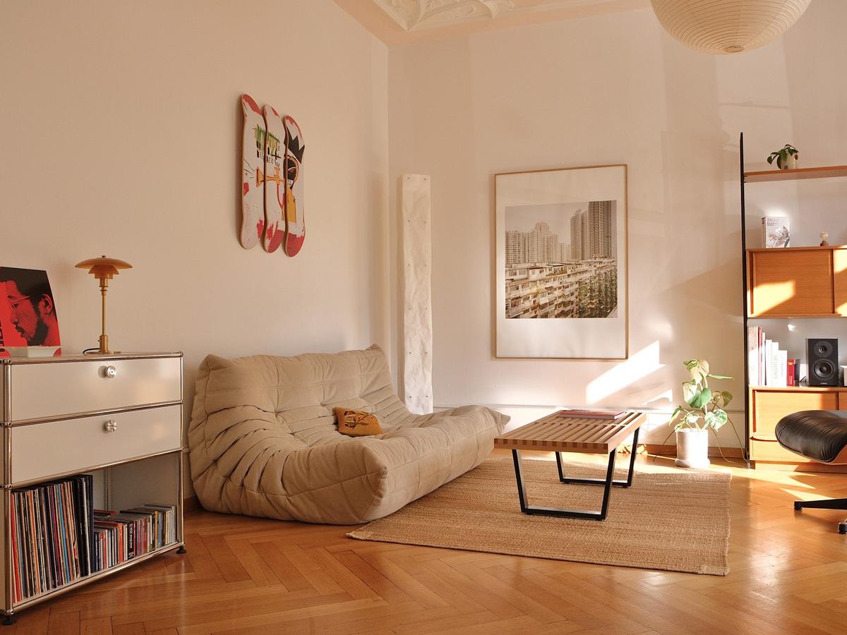 Im Wohnbereich fällt der entspannte Mix aus Midcentury Möbeln und Seventies Style auf. Designikonen aus unterschiedlichen Dekaden leben hier in friedlicher Koexistenz. Der Lounge Chair von Charles und Ray Eames und die Bench von George Nelson überzeugen auch neben dem angesagten Togo Sofa von Ligne Roset.