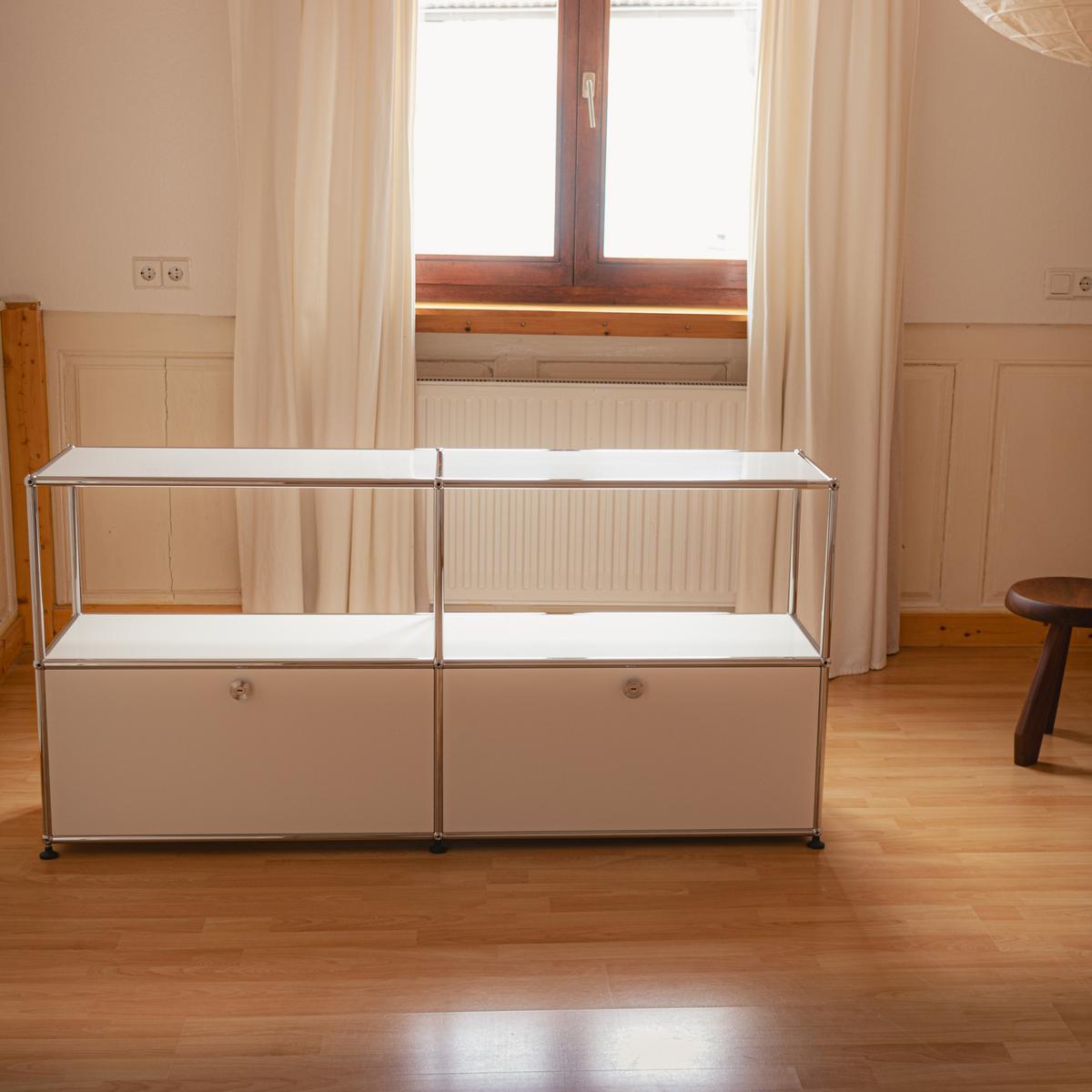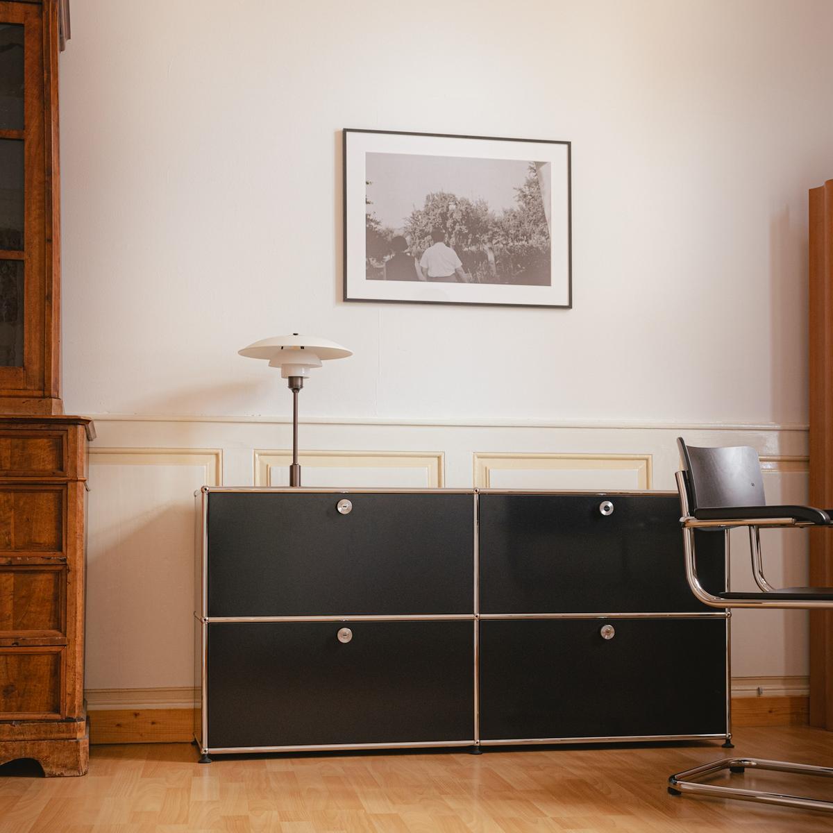 Yannick: Ich liebe zeitloses Design und für mein Arbeitszimmer brauchte ich unbedingt Stauraum. Bei meiner Recherche stieß ich dann auf USM, die ja schon seit 1960 ihre modularen Möbel produzieren. Und da ich im Arbeitszimmer einen antiken Holzschrank stehen habe, musste auf jeden Fall etwas Modernes und Schickes als Kontrast hin. So habe ich mir dann im Konfigurator für meinen damaligen Bedarf ein Sideboard erstellt, das ich jetzt drei Jahre später einfach erweitern konnte. Für mich ist es das perfekte Möbelstück für Räume, die nach (immer größer werdenden) Stauraum verlangen.