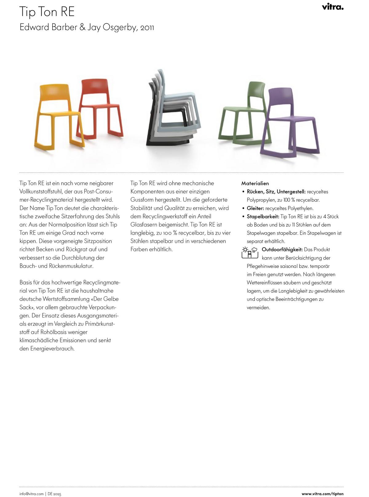 Mit dem Tip Ton RE bringt Vitra einen Tip Ton Stuhl auf den Markt, der sowohl aus recyceltem Polypropylen besteht, als auch zu 100 % recycelfähig ist und somit wiederum dem Stoff- und Produktionskreislauf zugeführt werden kann.