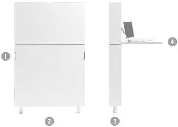 | Abmessungen | ![]() (1) Höhe: 113,5 cm (2) Breite: 71,7 cm (3) Tiefe: 12,2 cm (4) Arbeitshöhe: 74 cm |