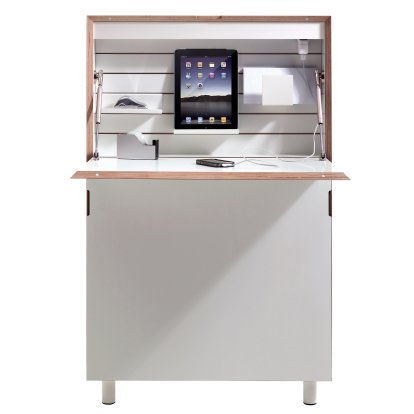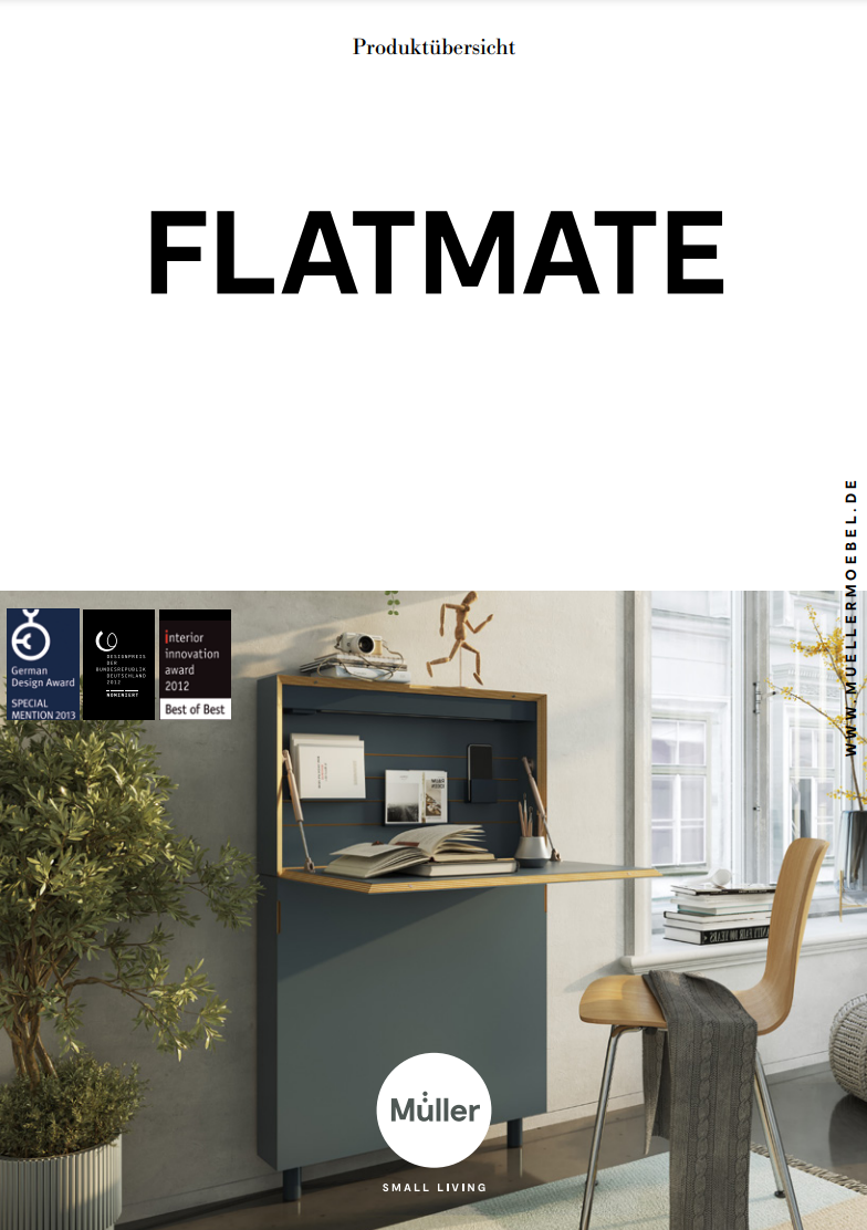 Der Sekretär Flatmate von Müller Small Living, aus CPL-beschichtetem Birkenschichtholz hält auf einer Grundfläche von 0,9 m² ungeahnte Möglichkeiten bereit: Neben den seitlichen Verstauräumen beinhaltet Flatmate ein dreiteiliges Ordnungsset, eine LED-Leiste, eine Steckdose und zwei USB-Anschlüsse. Mit dem preisgekrönten Design von 2012 hat Michael Hilgers so die perfekte Home-Office-Lösung gefunden.