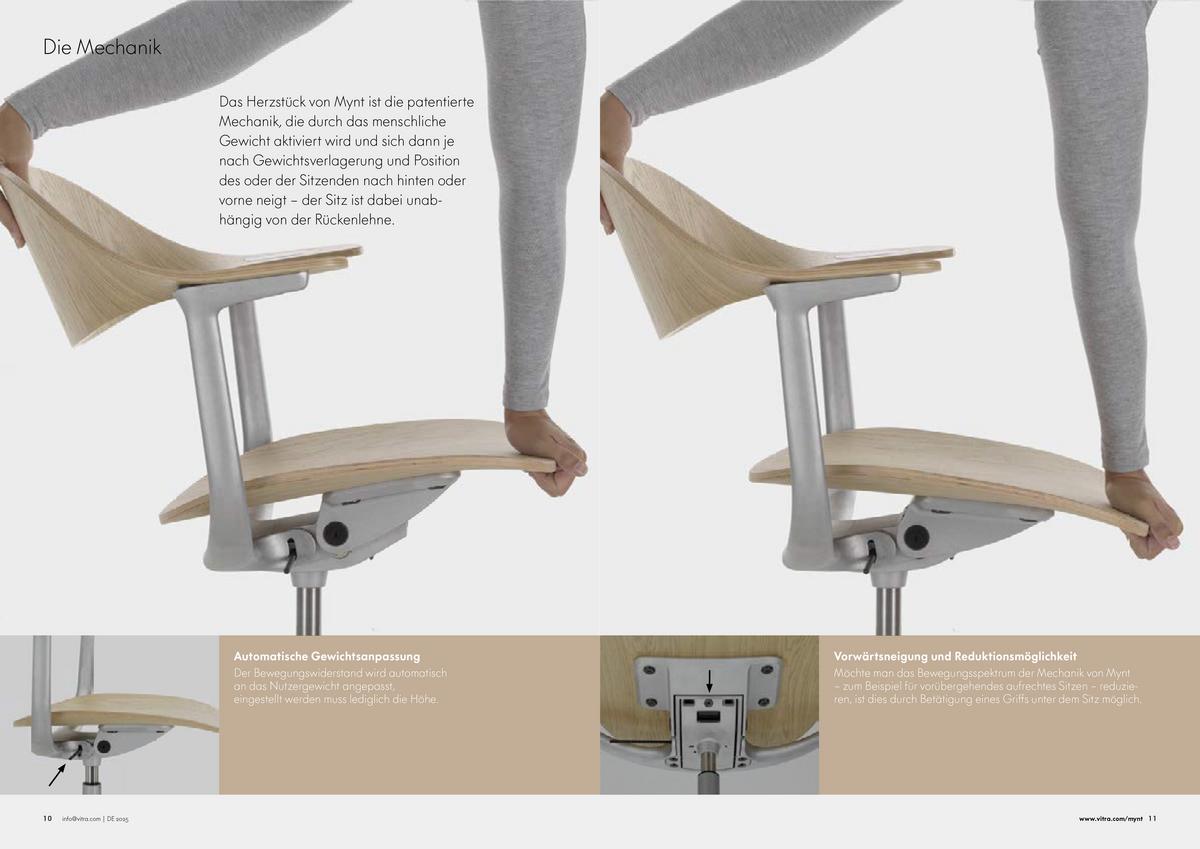 Recycling-Polyamid aus Post-Industrial-Abfällen, das zu 100 % recycelbar ist, kommt bei Mynt für die Sitz- und Rückenschalen zum Einsatz. Post-Industrial-Kunststoffe sind Abfallmaterial, das während Herstellungsprozessen, beispielsweise in der Automobilindustrie, anfällt. Sie haben hervorragende Fließeigenschaften, ermöglichen die Herstellung komplizierter Formen und glänzender Oberflächen und sind lebensmittelecht. Bei Vitra wird vorrangig Post-Consumer-Kunststoff verwendet. Wenn für ein bestimmtes Produkt kein Post-Consumer- Kunststoff geeignet ist, prüft Vitra, ob ein Post-Industrial- Recyclingmaterial eine mögliche Alternative sein könnte, wobei Post-Industrial-Abfälle aus den eigenen Produktionsstätten bevorzugt werden.