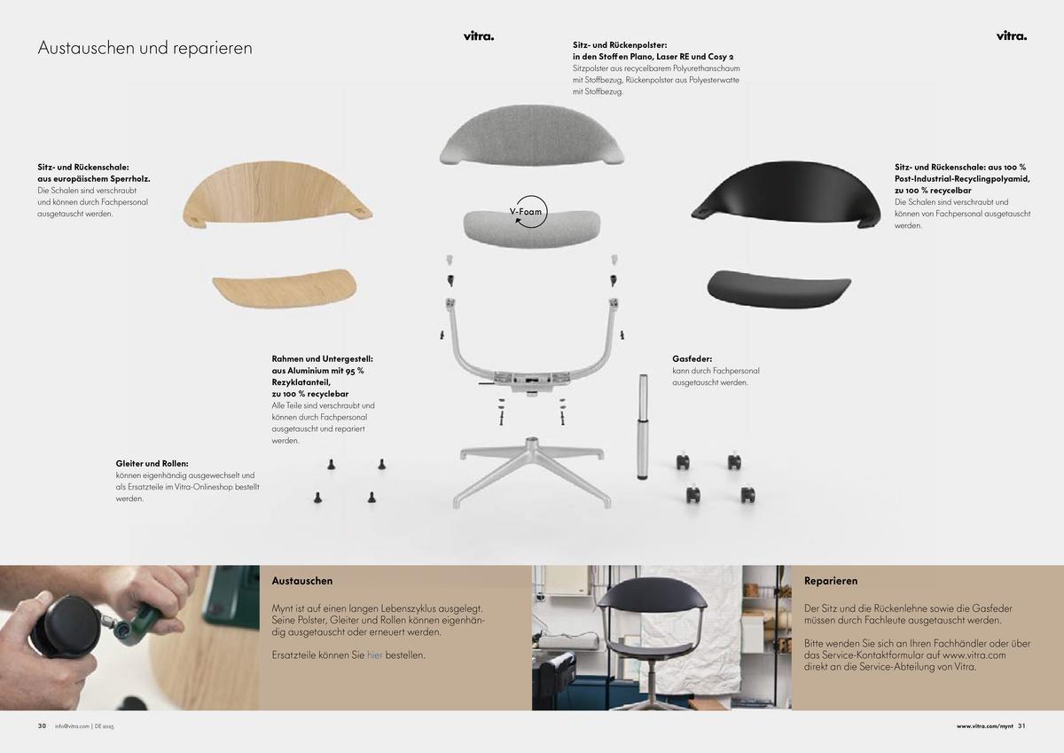 recycelt werden. Er wird dabei in einem energieeffi zienten Prozess in ein neues Polyol umgewandelt und in den Stoff kreislauf zurückgeführt und ist dann für neue Produkte verwendbar. Vitra setzt V-Foam ab 2025 sukzessive für alle Vitra-Möbel mit Formschaumpolsterung ein.