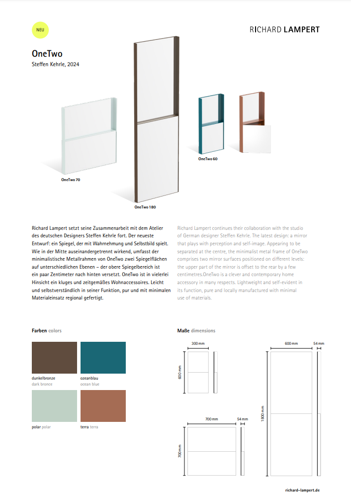 Der OneTwo Spiegel von Richard Lampert ist eine im Idustrie-Chic verpackte optische Illusion. Mit zwei unterschiedlich hervorstehenden Spiegelflächen erzeugt Designer Steffen Kehrle ein gezieltes Spiel mit Wahrnehmung und Selbstbild. In der Variante "OneTwo 60" kann der Spiegel, der in Deutschland entworfen und hergestellt wurde, zusätzlich mit einer klappbaren Front ausgestattet werden.