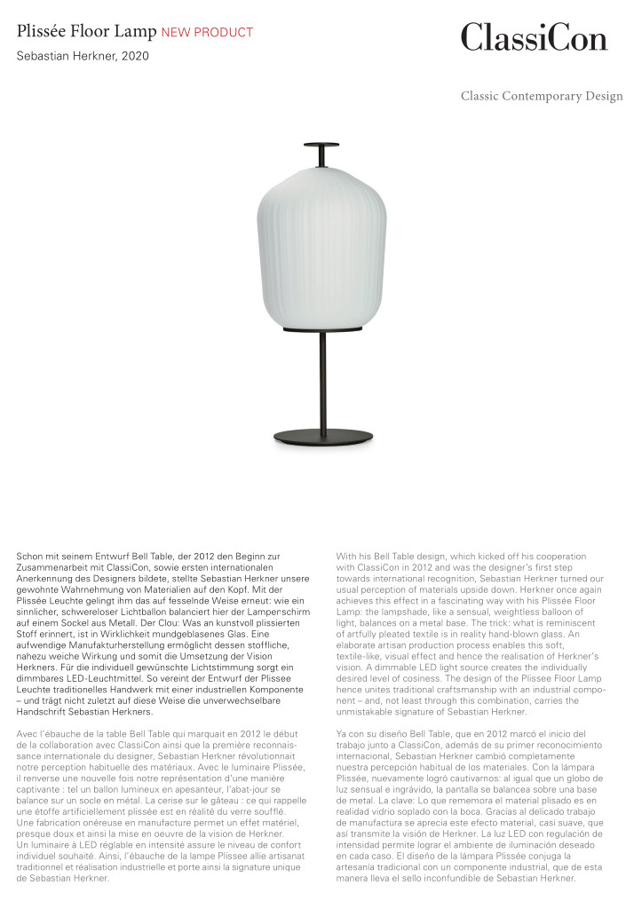 Mit seiner Plissée Stehleuchte für Classicon bleibt Sebastian Herkner seiner Passion treu. Der Designer spielt mit der gewohnten Wahrnehmung von Materialien und überrascht immer wieder: Der Schirm der Plissée Floor Lamp besitzt die feine Optik eines Plisseestoffes, besteht jedoch aus mundgeblasenem Glas und sorgt dank funktionaler Dimmfunktion für die gewünschte Lichtstimmung.