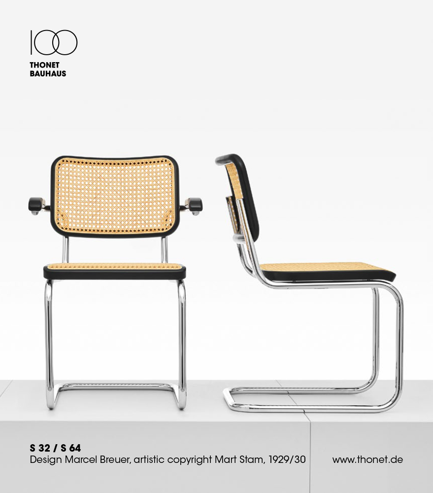 Als einer der Ersten beschäftigte sich Marcel Breuer mit dem neuartigen Stahlrohrkonzept und gestaltete einige berühmte Sitzmöbel wie den Freischwinger S 32 / S 32 N, der bis heute von Thonet produziert wird und zu den unangefochtenen Klassikern der Designgeschichte gehört. Neben Breuers Entwürfen befinden sich auch Designklassiker von Mart Stam, Le Corbusier und Ludwig Mies van der Rohe im Produktportfolio des Möbelherstellers aus dem hessischen Frankenberg.
