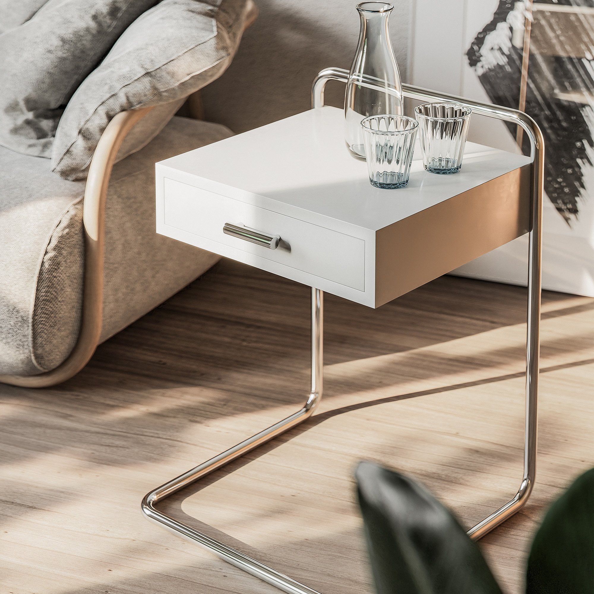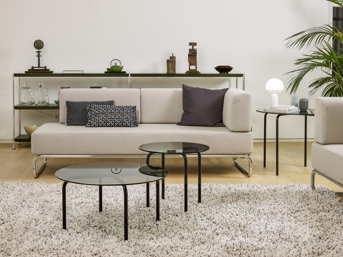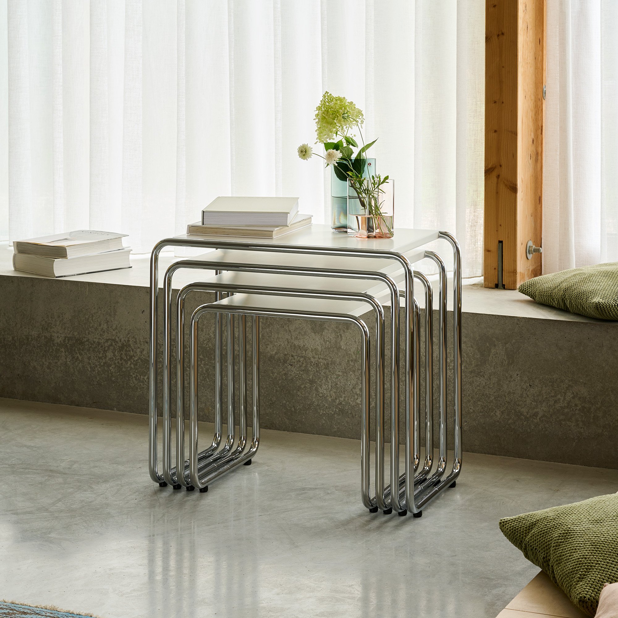 Neben den berühmten Stahlrohrfreischwingern und Bugholzstühlen führt das Traditionsunternehmen Thonet zahlreiche Couch- und Beistelltische in seinem Portfolio. Berühmteste Vertreter dieser Kategorie sind zweifelsohne die Thonet Satztische aus Stahlrohr, die der Architekt und Designer Marcel Breuer in den 1920er Jahren entwarf und die als Bauhaus-Klassiker in die Designgeschichte eingingen. Die minimalistischen Beistelltische lassen sich unkompliziert ineinanderschieben und verkörpern so den Bauhaus-Gedanken der Reduktion und des funktionalen Wohnens. Ursprünglich gestaltete Breuer den Thonet Satztisch B 9 für die Kantine des Dessauer Bauhaus-Gebäudes, zudem wurde er zur Möblierung der Studierendenapartments und der Meisterhäuser von Walter Gropius eingesetzt. Neben weiteren bekannten Designklassikern von Ludwig Mies van der Rohe bietet der Möbelhersteller aus dem hessischen Frankenberg zeitgenössische Entwürfe wie den modernen Beistelltisch 1025 von James Van Vossel.