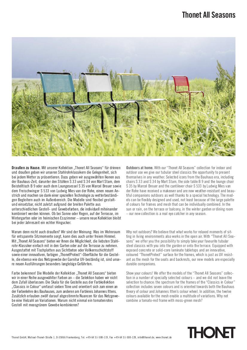 ...Auf der IMM Cologne 2016 präsentiert Thonet jetzt mit seiner neuen All Seasons Kollektion einen ganz besonderen Blick auf das Genre... Die Geschichte der Thonet Möbel (wie auch die des Möbeldesigns ganz allgemein) ist grundsätzlich eine Geschichte von Möbeln für den Innenbereich - wenn auch nicht ausschließlich...