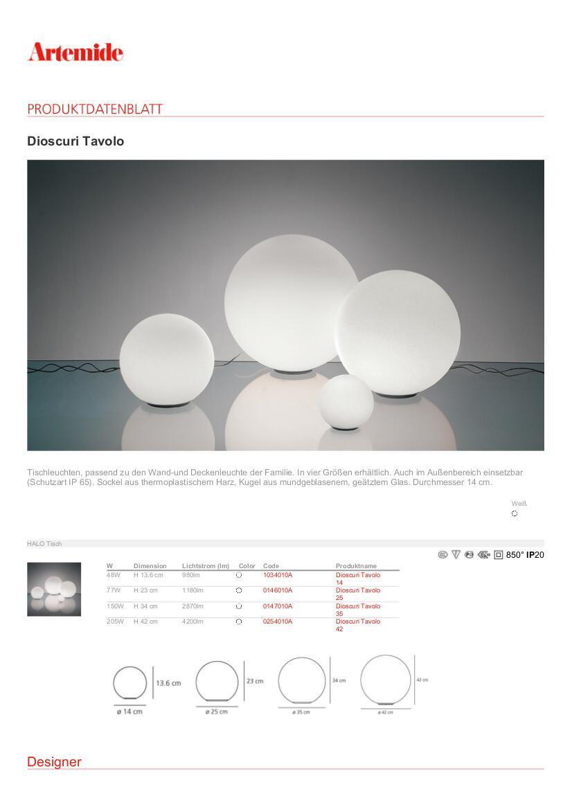 1960 in Italien gegründet, befasst sich das Unternehmen Artemide bis heute mit so ziemlich allem, was Leuchtmittel angeht. Von der Herstellung in zahlreichen Produktionsstätten und Glasmanufakturen weltweit über die Forschung nach nachhaltigen Innovationen in eigens eingerichteten Forschungszentren bis hin zu Direktvertrieb in Showrooms oder über Shop-in-Shop Systeme; Artemide gehört nicht nur wegen seiner vielfältigen und umfassenden Bemühungen bis heute zu den führenden Größen des Leuchtmittelmarkts. Innovation in Design und in Technik stehen immer im Mittelpunkt der Artemide Lampen und so werden alljährlich neue Designs des italienischen Herstellers ausgezeichnet oder sind dauerhafter Bestandteil internationaler Ausstellungen in den Metropolen der Welt. Dass dabei immer wieder clevere Lösungen realisiert werden, beweist u.a. Artemides Dioscuri Tavolo. Ihre spezielle Kugelform macht sie vielseitig einsetzbar - ob sie nun als Tischleuchte ihr warmes Licht in alle Richtungen versprüht oder auf dem Boden als indirekte Raumerhellung dient. Ihr Designer Michele De Lucchi ist eigentlich vor allem im Bereich Industriedesign bekannt; außerdem wirkt er mit Vorliebe an großen architektonischen Projekten mit. Dass er dabei das Auge fürs Gebrauchsobjekt nicht verloren hat, beweist sein Lampendesign Dioscuri Tavolo: So schlicht und prägnant ist die Kugelleuchte, dass man sich ihrer beruhigenden Wirkung kaum entziehen mag. Genau das ist auch der Kern der Artemide Philosophie, „The Human Light“, wonach jeder Licht und dessen Stimmung anders wahrnimmt und weshalb die Beleuchtung von Räumen ebenso individuell wie die Menschen sein sollte, die darin leben.