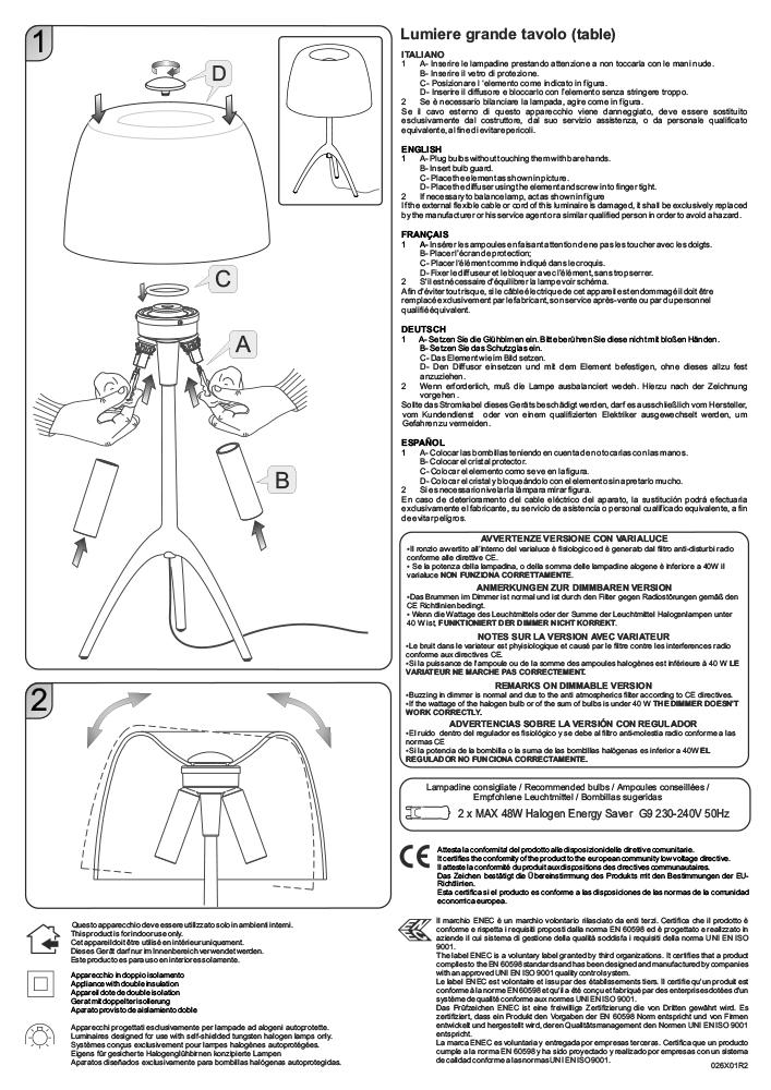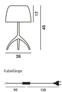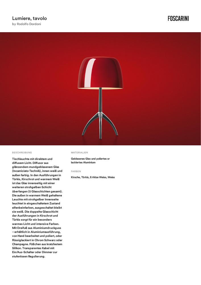 | Ausführungen | Wahlweise mit Dimmer Alternativ ist die kleinere Tischleuchte Lumiere 05 Tavolo Piccola erhältlich. Untergestell in den Farbausführungen Chrom-schwarz oder Champagner auf Anfrage erhältlich. |