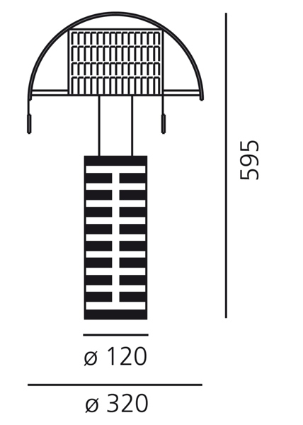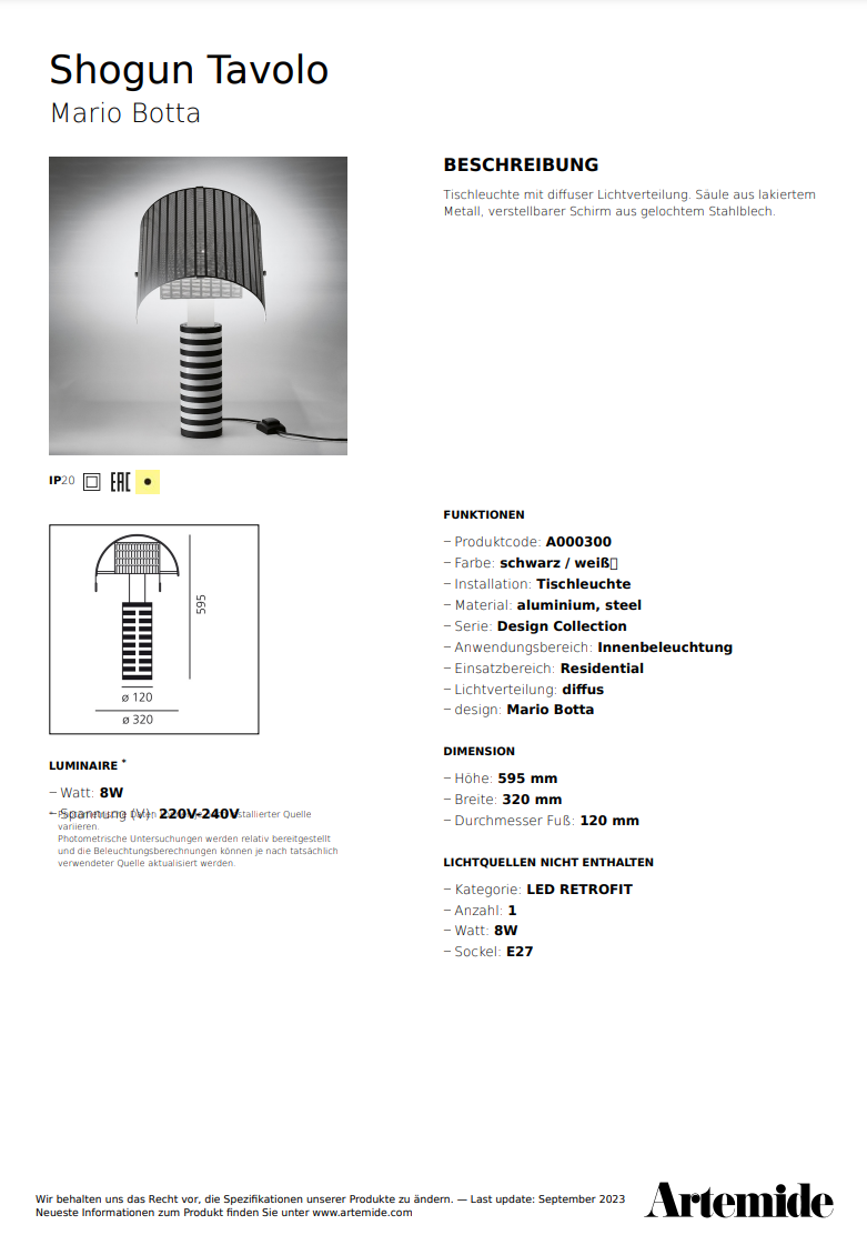 Mit ihren verstellbaren Schirmen aus gelochtem Stahlblech kommt die Shogun Tischleuchte von Artemide sehr lebendig daher, da das Design des Italieners Mario Botta mit seiner menschlichen Silhouette und dem gestreiften Leuchtenfuß an einen Samurai erinnert.