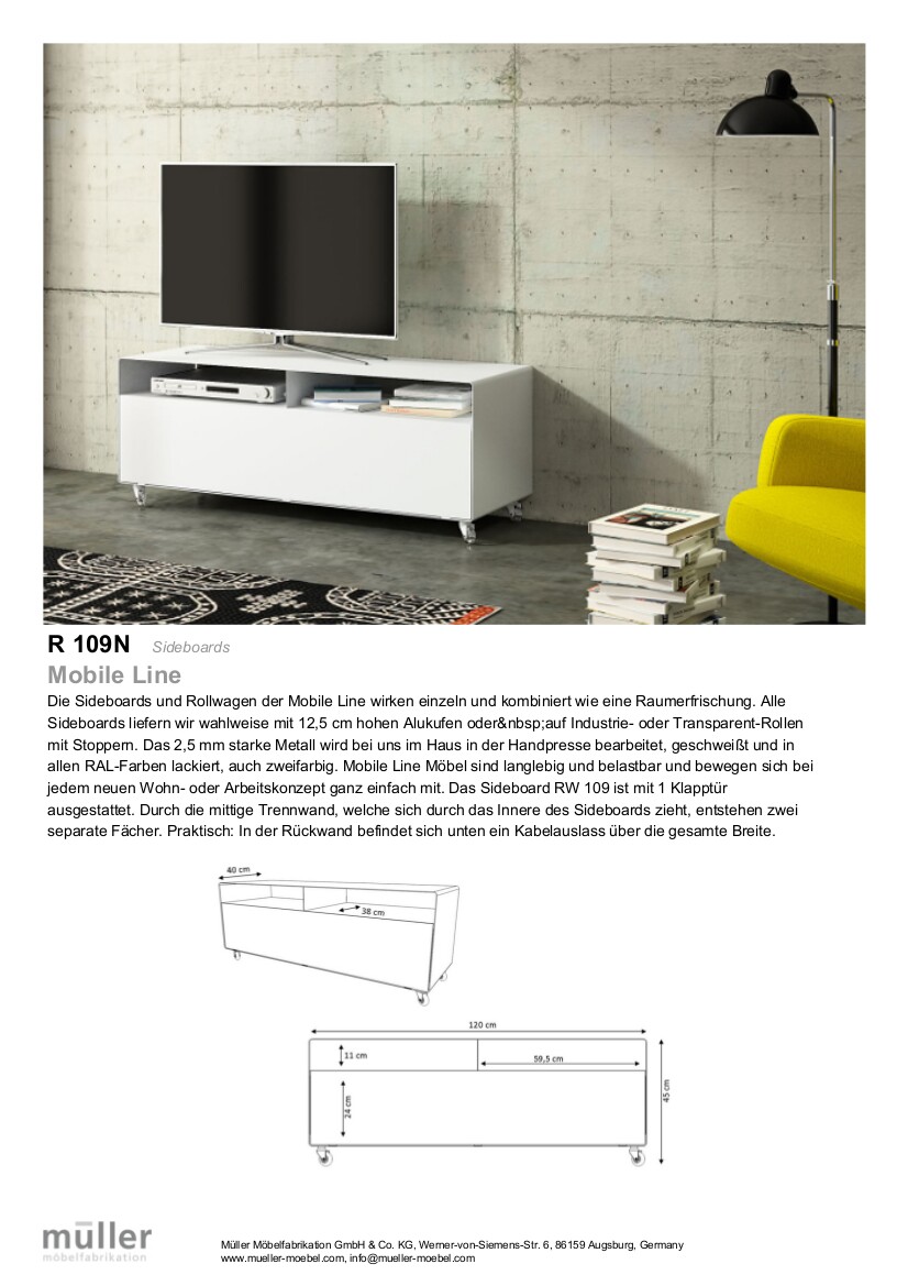 | Funktion & Eigenschaften | Handgeschweißt aus 2,5 mm starkem Stahlblech Mit Klapptür und 2 Ablagefächern Inkl. Kabelauslass in Rückwand: H 4 cm Position Kabelauslass: unten, über gesamte Breite Belastbarkeit bis 50 kg Industrie- und Transparentrollen jeweils mit Feststeller hinten |
