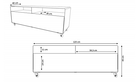 | Abmessungen | Außenmaße mit Rollen: H 45 x B 119,5 x T 40 cmAußenmaß mit Kufen: H 50,5 x B 119,5 x T 40 cm Innenmaß oben: je Fach H 11 x B 59,5 x T 40 cm Innenmaß unten: je Fach H 24 x B 59,5 x T 38 cm |