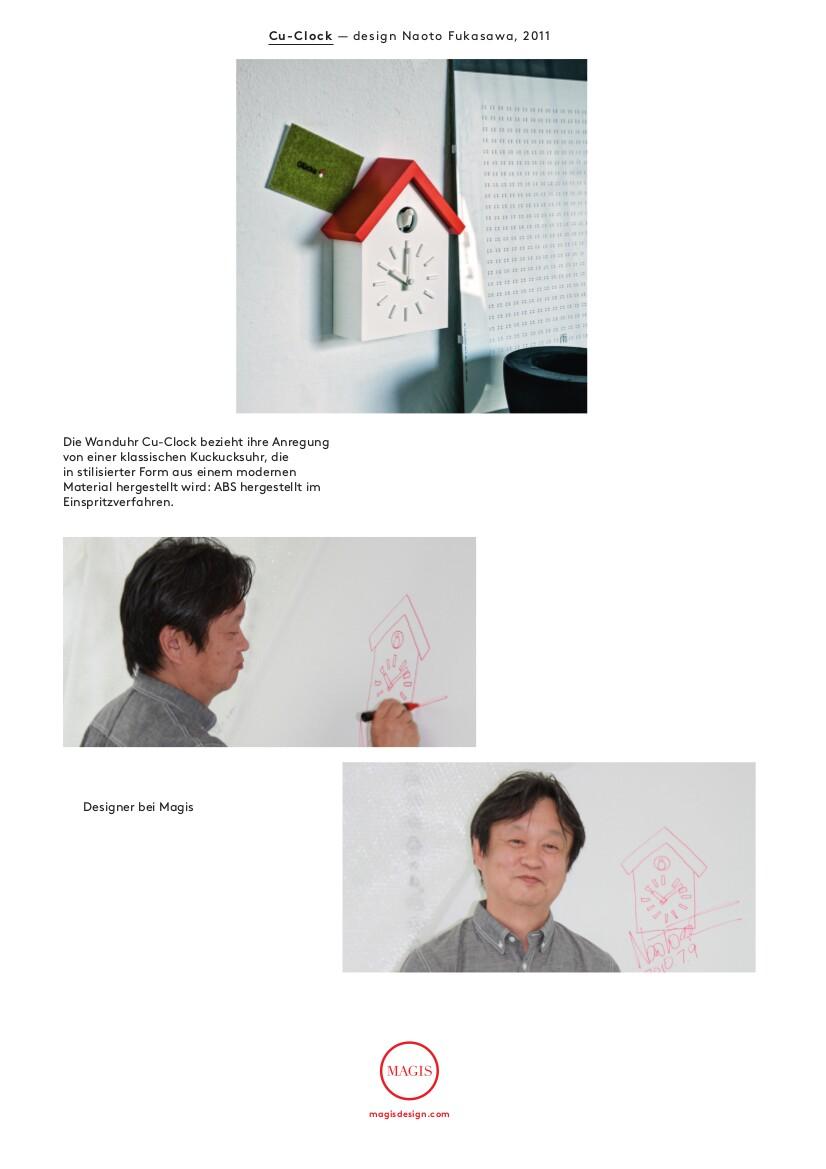 Der japanische Designer Naoto Fukasawa, geboren 1956, entwarf die Cu-Clock Wanduhr 2011 für den italienischen Hersteller Magis. Der international renommierte Industriedesigner schuf mit der Cu-Clock Uhr eine Neuinterpretation der klassischen Kuckucksuhr, die sich, anders als ihr Vorbild, als schlichteres und doch interessantes Accessoire in verschiedene Raumsituationen einfügt. Während der traditionsreiche Klassiker aus dem Schwarzwald massiv und mit zahlreichen Verzierungen auftritt, überzeugt die Magis Neuversion durch klare Linien und zurückhaltendes Design. Die CU-Clock Wanduhr wird aus ABS im Standard-Einspritzverfahren hergestellt und ist in verschiedenen Farbvariationen erhältlich. In Kooperation mit zahlreichen namhaften Designern transportiert der Hersteller Magis den oftmals speziellen Charakter des italienischen Möbeldesigns in die Gegenwart. Dies gelingt dem Unternehmen unter Einsatz verschiedener Materialien und Techniken.