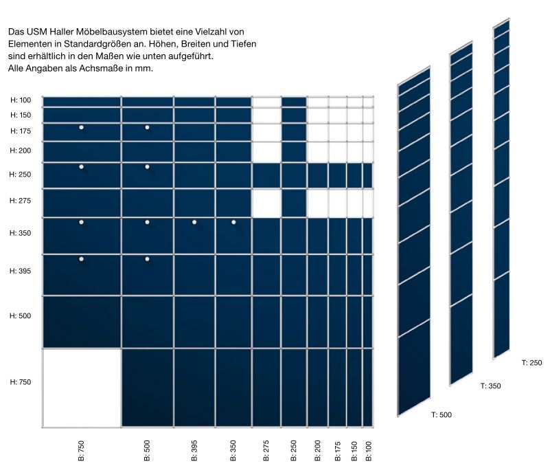 Fast alles ist möglich mit dem USM Möbelbausystem. Die USM Möbel und Accesoires gibt es in unzähligen Maßen und Farben. Selbstverständlich sind auch Anpassungen der im Shop vorkonfigurierten Möbel möglich.