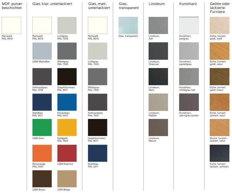 Die Tablare der USM Haller Regale können in 14 Standardfarben geliefert werden - passend zu Ihren individuellen Vorlieben. Im smow Onlineshop sind viele Farben lagervorrätig und sofort lieferbar. Und auch bei den USM Haller Tischen und anderen USM Artikeln steht Ihnen eine große Auswahl verschiedener Oberflächen und Farben zur Verfügung, sodass auch hier immer den persönlichen Anforderungen entsprechend der passende Tisch konfiguriert werden kann.