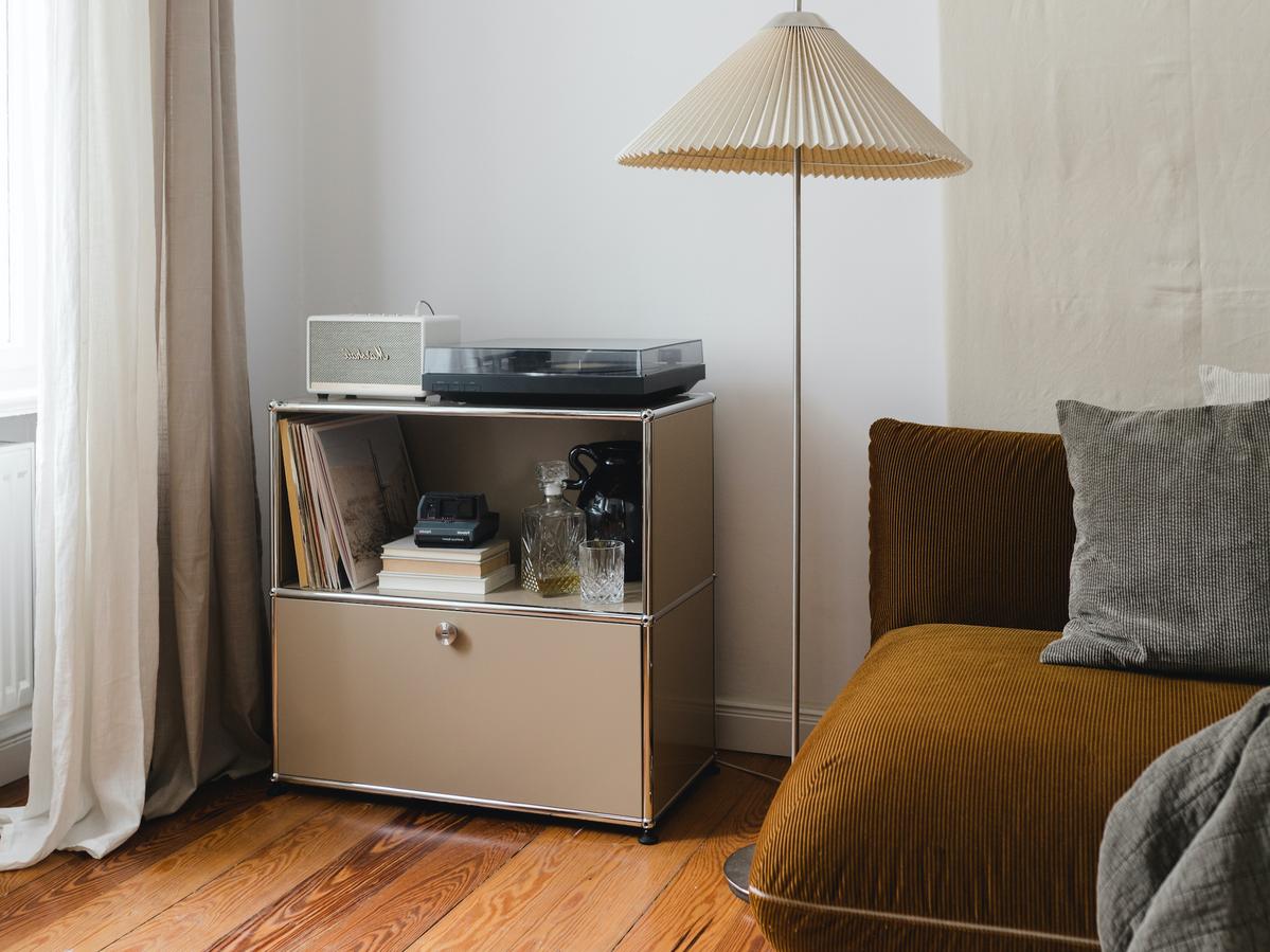 Minibar, Hifi-Sideboard und Schließfach in einem: USM Beistelltisch mit zwei Fächern und einer Klapptür