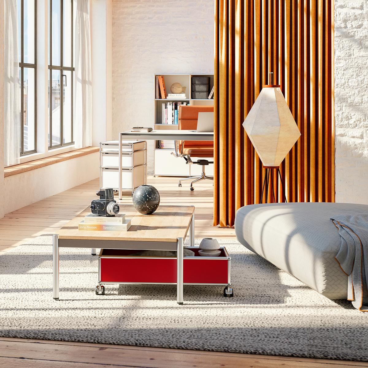 USM Haller Couchtisch mit Holzplatte und ergänzender USM Haller Rollbox