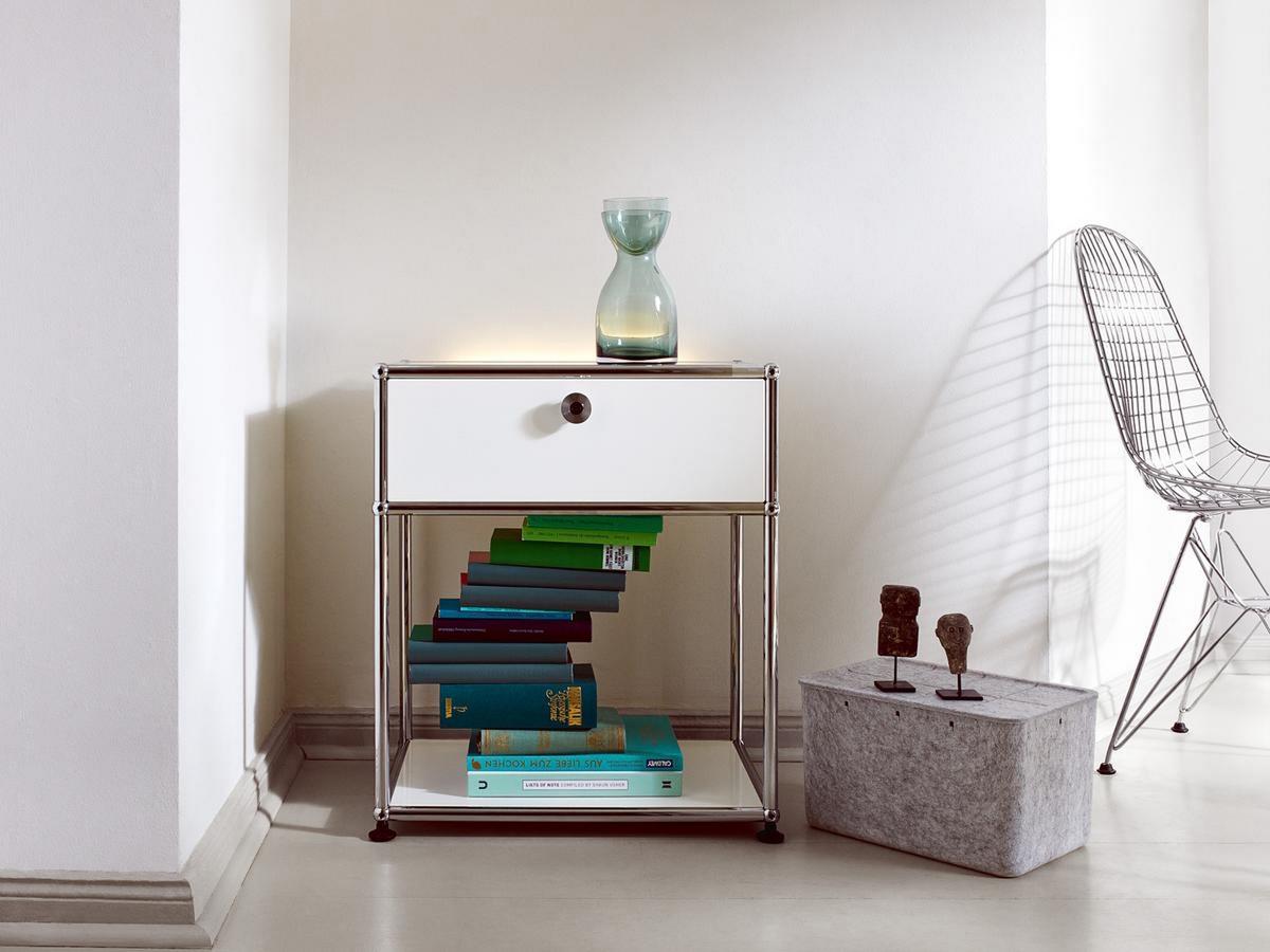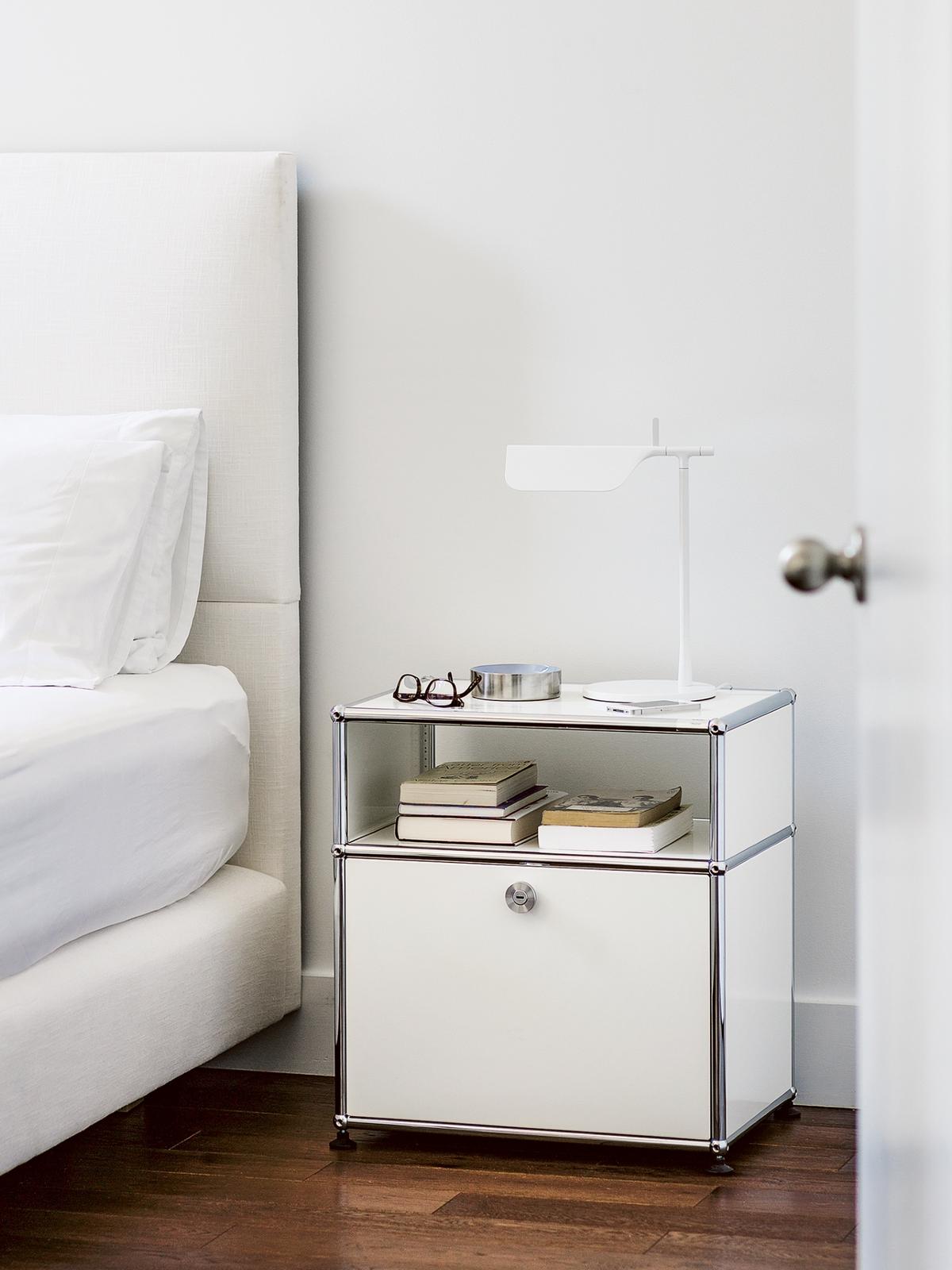 Im Schlafzimmer: Der USM Haller Beistelltisch mit Schublade bietet Platz für Bücher, Leselampe und persönliche Gegenstände. Wer auch beim Beistelltisch nicht auf zusätzlichen Stauraum verzichten möchte, findet mit den USM Haller Nachttischen wie dem USM Haller Nachttisch mit Schublade oder dem USM Haller Nachttisch mit zwei Klapptüren die passende Lösung. Besonders extravagant und dabei praktisch ist der USM Haller E Nachttisch mit dimmbarem Licht, das nicht nur im Schlafzimmer für eine angenehme Atmosphäre sorgt.