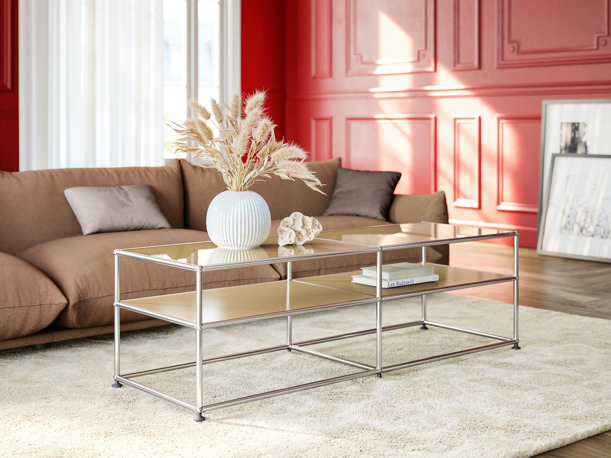 Leicht oder massiv?: Ein USM Haller Beistelltisch mit Glasplatte lässt Räume offen und luftig wirken, während Modelle mit Metalltablaren besonders stabil und langlebig sind. Je nach Konfiguration sind die USM Haller Beistelltische mit Glas- und Metalloberflächen oder auch mit Tischplatten aus Holz oder Linoleum erhältlich.