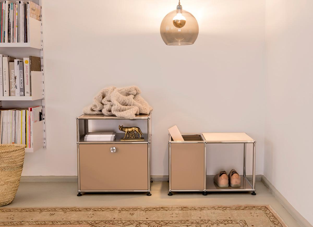 ► Flur & Garderobe: Unter Wandhaken oder Spiegeln bieten USM Lowboards Platz für Schuhe, Taschen oder Accessoires und können zum Beispiel durch ein zusätzliches Modul als Schirmständer genutzt werden.
