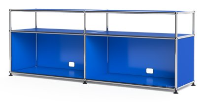 USM Haller Lowboard L mit Aufbau, individualisierbar, Enzianblau RAL 5010, Offen, Mit Kabeldurchlass unten mittig