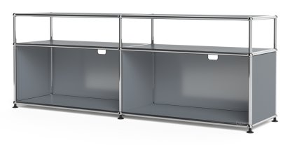 USM Haller Lowboard L mit Aufbau, individualisierbar, Mittelgrau RAL 7005, Offen, Mit Kabeldurchlass oben mittig