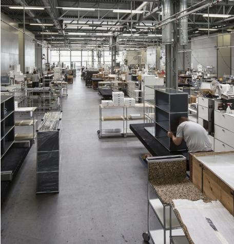 Am Schweizer Firmenhauptsitz in Münsingen werden sämtliche USM Haller Bestandteile produziert und die Metalltablare in den 15 Farben in einem umweltverträglichen Lackierungsverfahren pulverbeschichtet. Die Montage für den deutschen Markt erfolgt in Bühl, Baden-Württemberg oder direkt beim Händler bzw. Endkunden durch speziell ausgebildete Monteure. USM spart durch das Versenden von Einzelteilen schon beim Transport wertvolle Ressourcen. Und auch das fertige USM Haller Regal erweist sich als ein ökologisch nachhaltiges Produkt, da zum einen nur hochwertige, also sehr langlebige Materialien eingesetzt werden und USM Möbel zum anderen flexibel den sich wandelnden Anforderungen angepasst werden können, indem auf Grundlage des Materials vorhandener Konstruktionen neue Möbel geplant werden.