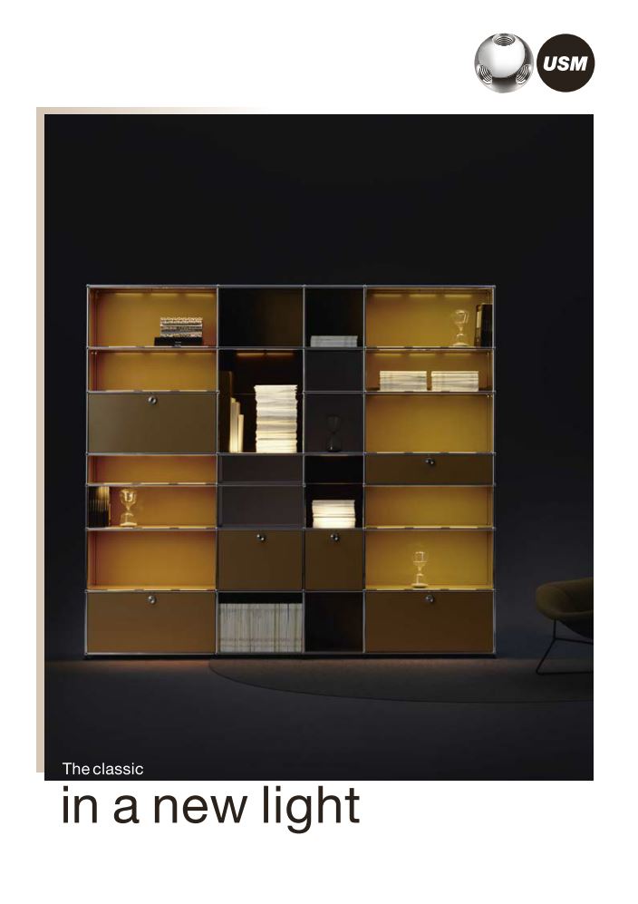 Auf der Mailänder Möbelmesse präsentierte USM 2017 erstmals die neue Beleuchtung als integralen Bestandteil des USM Möbelbausystems. Mithilfe von e-Kugeln, e-Connectoren und e-Rohren wird der Strom in der Möbelstruktur an die gewünschte Stelle geleitet. Elegante Leuchtkörper rücken so das altbewährte USM Regal in ein ganz neues Licht und setzen gezielt Akzente! Durch einfach einklinkbare USB Charger wird der Designklassiker außerdem zur Ladestation für mobile Geräte. Kabellos, dimmbar, modular - Das ist das neue USM Haller E.
