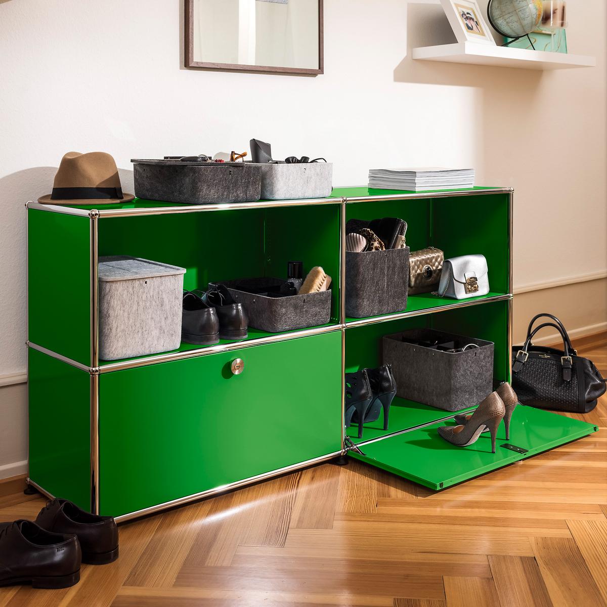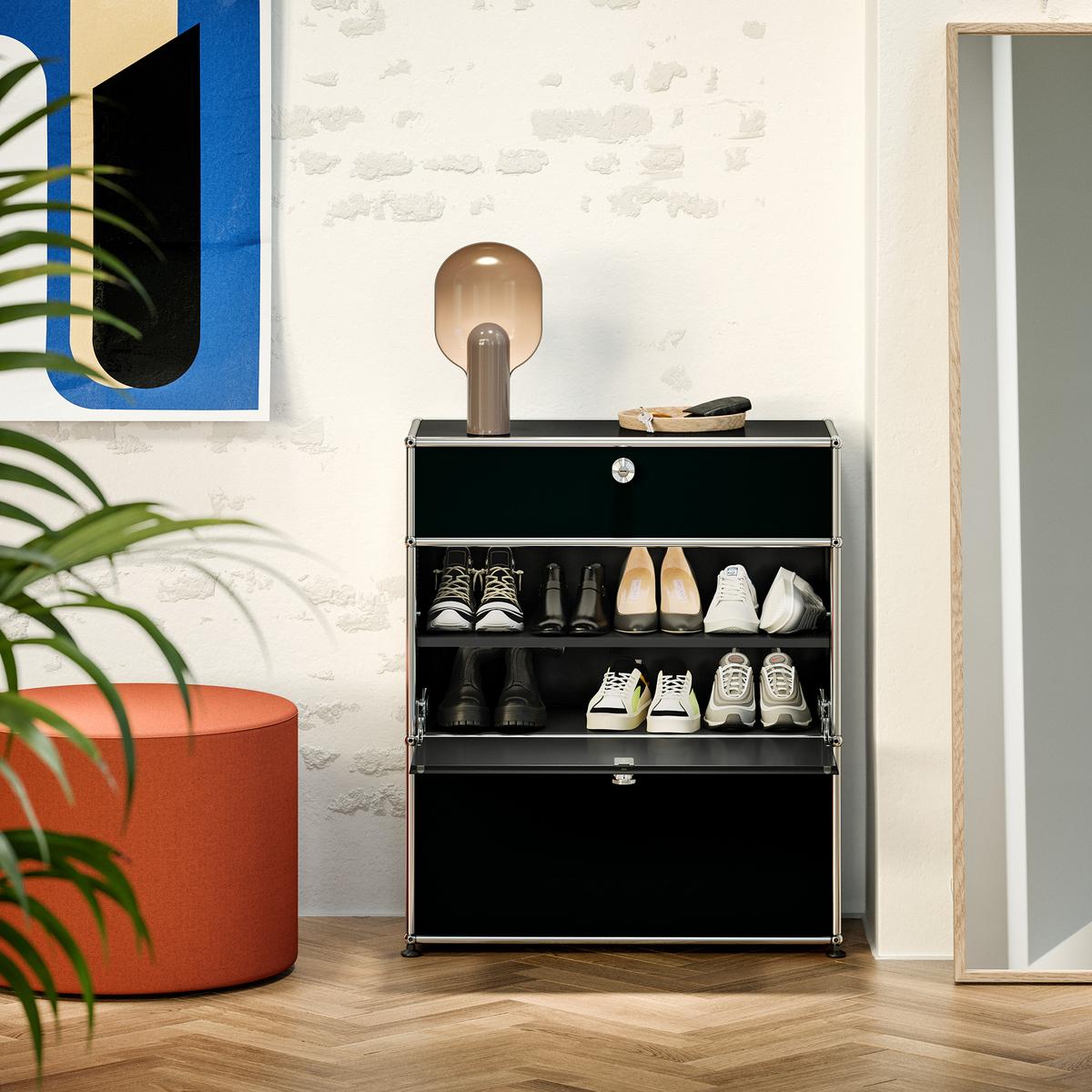 ► USM Haller Schuhregale: Ob offen, geschlossen oder kombiniert mit Sitzfläche – die USM Haller Schuhregale sorgen für Übersicht und Struktur im Eingangsbereich. Durch ihre modulare Bauweise passen sie sich jeder Raumgröße und Stilrichtung perfekt an.