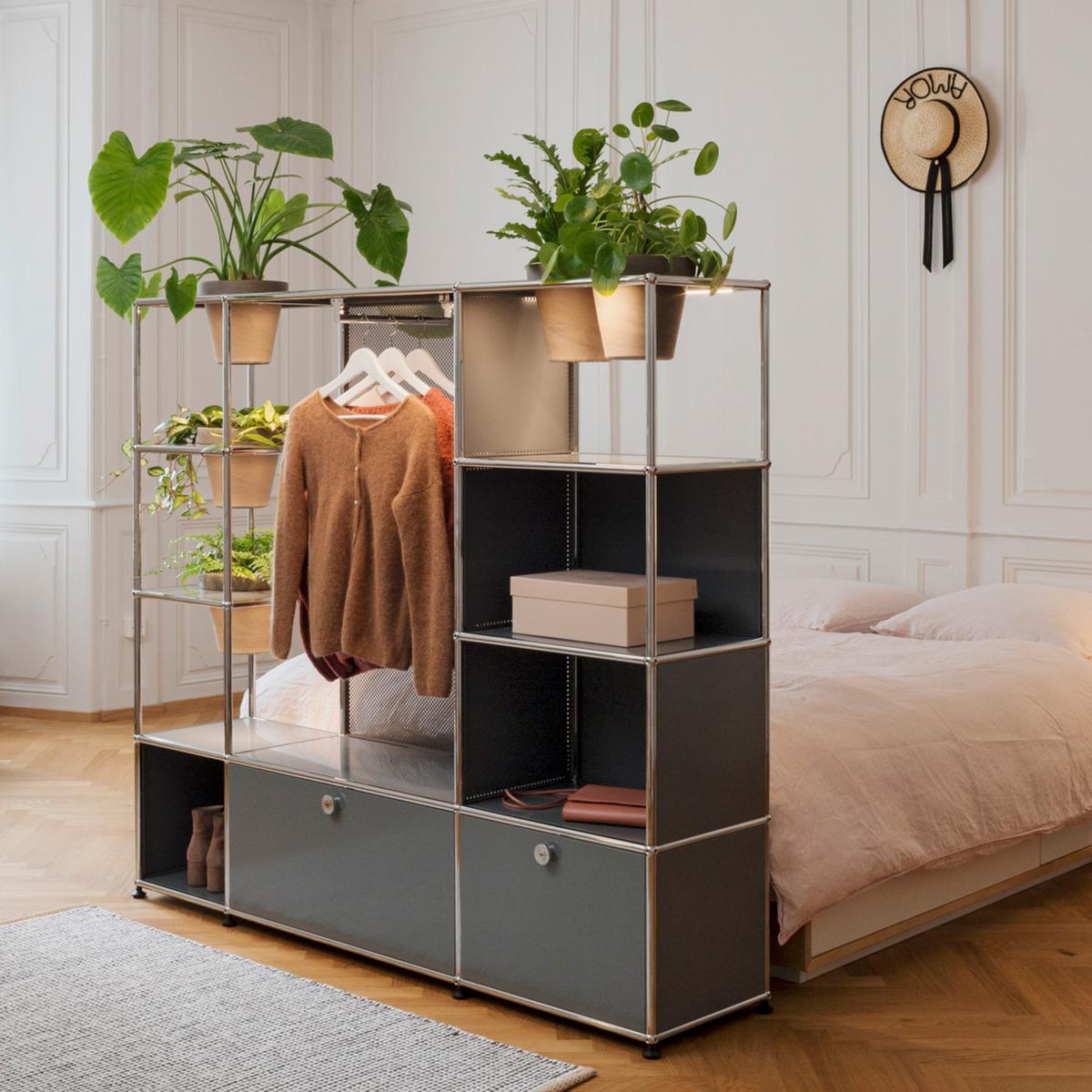 Individuell konfigurierte USM Haller Garderobe mit Pflanzeneinsatz, Sitzfläche, Kleiderstange, sowie offenen und geschlossenen Regalelementen
