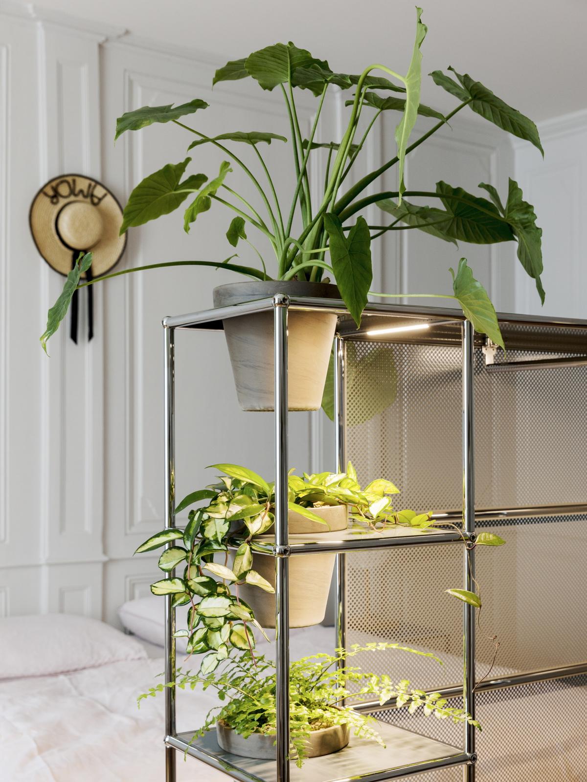 Sie möchten Ihr Wohnzimmer in einen Urban Jungle verwandeln, züchten bereits fleißig Pilea-Ableger und verfolgen gebannt den Hashtag #monsteramonday auf Instagram? Oder suchen Sie nach einer Lösung für etwas mehr Grün in Ihrem persönlichen Wellnessbereich zuhause, um Ihr cleanes Einrichtungskonzept etwas aufzubrechen? Mit dem Konzept USM Pflanzenwelten bietet der Schweizer Hersteller die perfekte Lösung für jeden Bedarf. Ganz im Sinne des modularen Grundkonzepts von USM Gründer Fritz Haller lässt sich das USM Begrünungssystem problemlos in bestehende USM Haller Möbel integrieren: Die neuen USM Tablare mit kreisrunden Aussparungen für Topfpflanzen werden ganz einfach in die Struktur Ihres USM Regals eingesetzt. Dem sachlichen, minimalistischen Raster des USM Haller Möbelbausystems wird so ein organischer Kontrast entgegengesetzt. Wem das noch nicht genug Gestaltungsmöglichkeiten sind, der sollte sich USM Haller E ansehen. Das USM Beleuchtungssystem lässt sich unkompliziert in die USM Regale integrieren und setzt Kleidung, Bücher und Pflanzen in Szene.