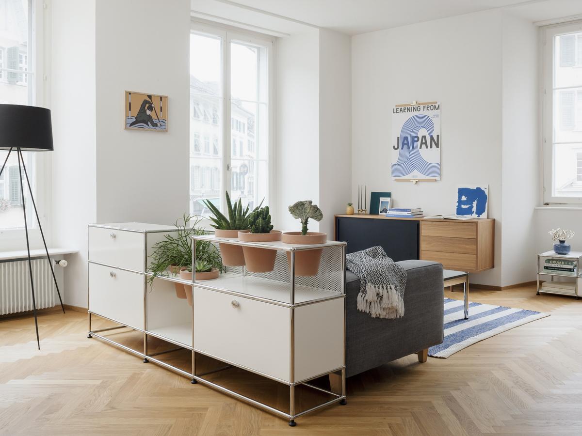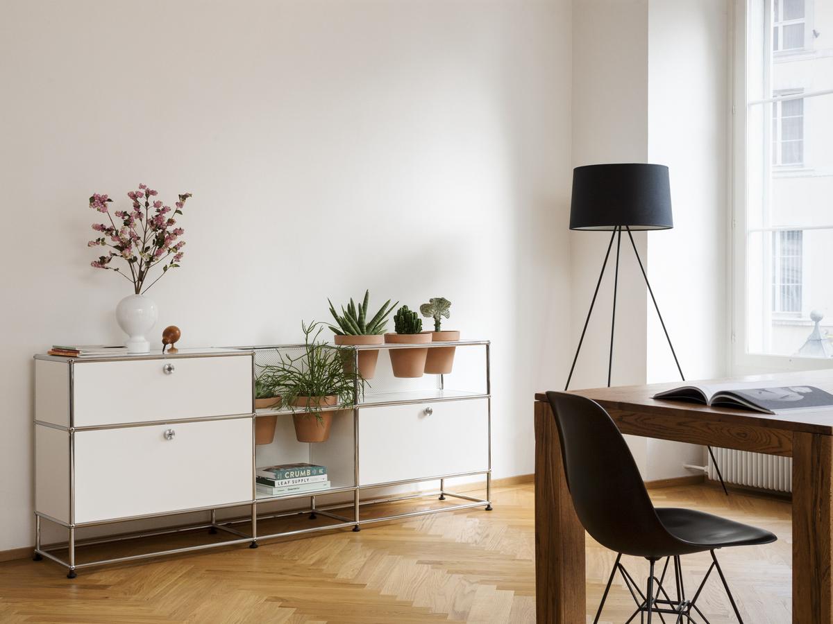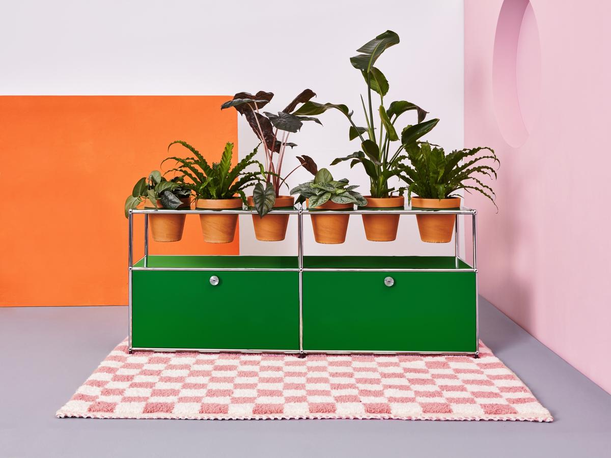 Ob einzelne Zimmerpflanzen gekonnt in Szene gesetzt, oder ein botanischer Minigarten im Wohnraum, mit dem System von USM sind Ihrem Gestaltungsdrang kaum Grenzen gesetzt. Kombinieren Sie unterschiedliche Pflanzentypen wie Kakteen, Sukkulenten, Farne oder auch Hängepflanzen miteinander, oder setzen Sie mit blühenden Zimmerpflanzen wie Orchideen oder Klivia auf Farbakzente. Grüntöne, bei Pflanzen ist der Pflanzenfarbstoff Chlorophyll für die grüne Farbe verantwortlich, wirken sich grundsätzlich harmonisierend, ausgleichend und konzentrationsfördernd auf uns aus. Dieser Effekt lässt sich je nach Farbe Ihres USM Möbels verstärken. USM Sideboards in Rubinrot oder Goldgelb setzen in Kombination mit Pflanzen besonders dynamische, sommerliche Kontraste.