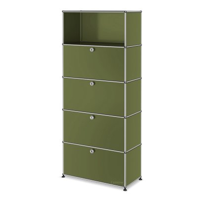 Die Geschichte des USM Aktenregals, des USM Haller Sideboards genau wie aller anderen USM Möbel beginnt Anfang der 1960er Jahre, als der Schweizer Betrieb USM in ein modernes Industrieunternehmen umstrukturiert werden soll. Der damalige Firmeninhaber, Paul Schärer, beauftragte damals den Architekten Fritz Haller mit der Planung neuer Betriebsanlagen. Nach Fertigstellung der Neubauten entwickelte Fritz Haller dann im Jahr 1963 das USM Möbelbausystem als Inneneinrichtung für den USM Büropavillon in Münsingen. Ursprünglich nur für den firmeneigenen Bedarf konzipiert, ging USM Haller sechs Jahre später, nach der Ausstattung der Pariser Rothschild Bank, in Serienproduktion. Das Besondere der USM Haller Regale ist heute wie damals die modulare Konzeption: aus gerade einmal drei Grundelementen können Möbel in beinahe allen erdenklichen Formen konstruiert werden. In die Grundstruktur aus verchromten Metallrohren, die mit ebenfalls verchromten Metallkugeln verbunden sind, werden Tablare aus Metall oder Glas eingesetzt. Schließlich kann das Möbel mit verschiedenem Zubehör, wie Türen, Rollen, Schlössern und Zwischentablaren, ausgestattet werden. Das individuell konfigurierbare USM Aktenregal mit Klappen/Auszügen verfügt über fünf Fächer, die wahlweise mit Klappen oder Auszügen ausgestattet werden können.