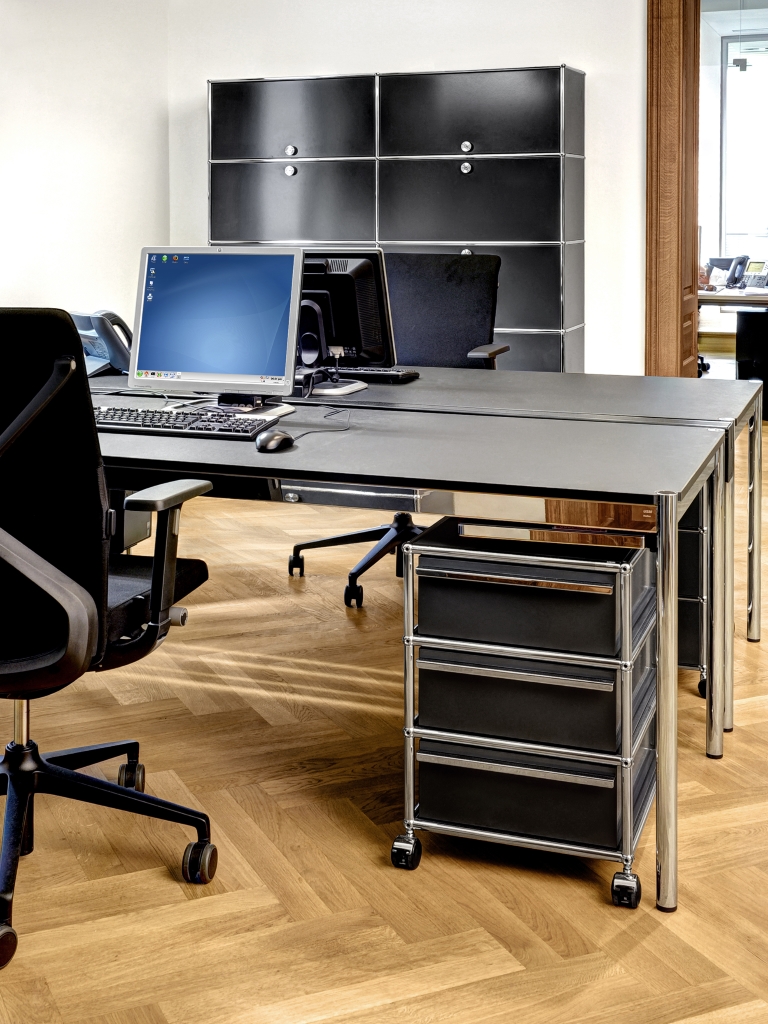 Die USM Haller Rollcontainer können je nach Bedarf individuell konfiguriert werden. Mit Hängeregistratur oder verschiedenen Schubladenvarianten erhältlich und optional auch mit Schloss versehen, passen die USM Rollcontainer perfekt unter die USM Haller Tische und komplettieren so den zeitlos-eleganten Look im Büro. Auch ein Druckercontainer, ein Computer Trolley und sogar ein Barwagen sind Bestandteil der USM Rollcontainer Kollektion. Die Tablare bestehen aus pulverbeschichtetem Metall, je nach Wunsch in Ihrer liebsten USM Farbe. Struktur und Kugeln bestehen passend zum restlichen Möbelbausystem aus verchromtem Stahl beziehungsweise Messing. Die Rollen sind – dem Boden angepasst – in einer weichen und in einer harten Variante erhältlich. Praktisch sind auch die auf Zug wie auf Schub gebremsten Schubladen, die geräuscharm in ihrer Handhabung und so perfekt für den Arbeitsplatz sind.