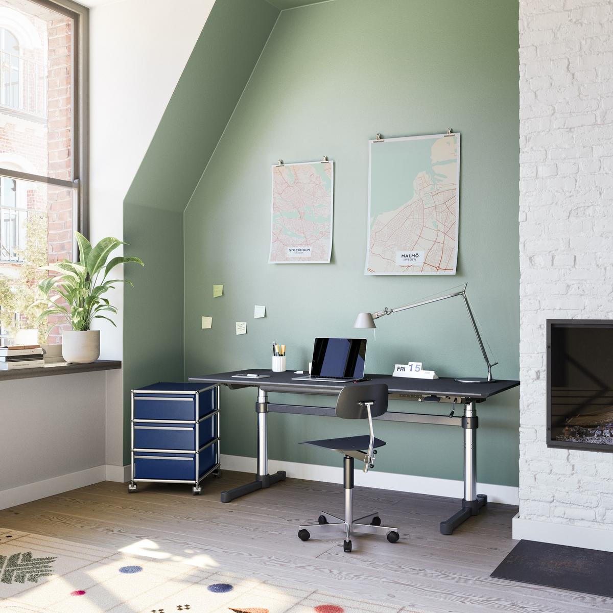 Die USM Schreibtische machen immer eine repräsentative Figur im Büro oder Arbeitszimmer und lassen bei ihren unzähligen Konfigurationsmöglichkeiten kaum einen Wunsch offen. Das schlichte, verchromte Untergestell korrespondiert perfekt mit der Tischplatte, welche in typischer USM Manier in einer Vielzahl an Materialien, Farben und Ausführungen erhältlich ist. So ergibt sich für jeden Anwendungsbereich das passende Design. Ob in seiner klassischen Version oder in den Varianten Plus, Advanced oder Access, die USM Schreibtische schließen sich der funktionalen Ausrichtung des USM Möbelbausystems konsequent an. So vielfältig wie die Tische selbst ist auch das Tischzubehör, das für jeden Bedarf etwas in petto hat: Ob Schwenkarm, Aufbau-, Front- und Seitenblenden für verschiedenste Tischlängen, Steckerleisten, USB-Anschlüsse, CPU-Halter und -Träger oder auch Kurbeln für synchrone Höhenverstellung – beim USM Haller Tischzubehör wurde an alles gedacht. So können die verschiedenen USM Haller Schreibtische jedem individuellen Bedürfnis entsprechend konfiguriert werden und garantieren so ein einmaliges Arbeitserlebnis – im Home Office, im Büro oder im Konferenzraum.